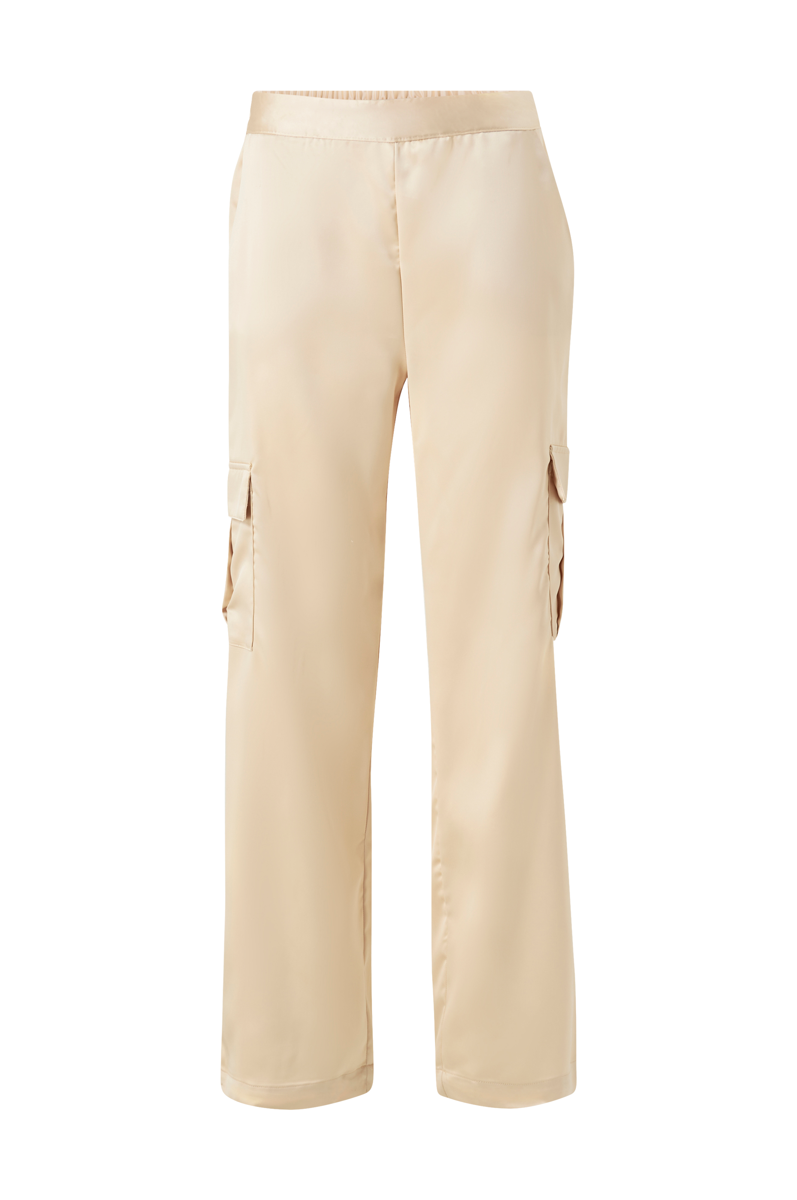 • Brede bukser i satin• Elastisk bånd bagpå ved taljen• Sidelommer• Benlommer