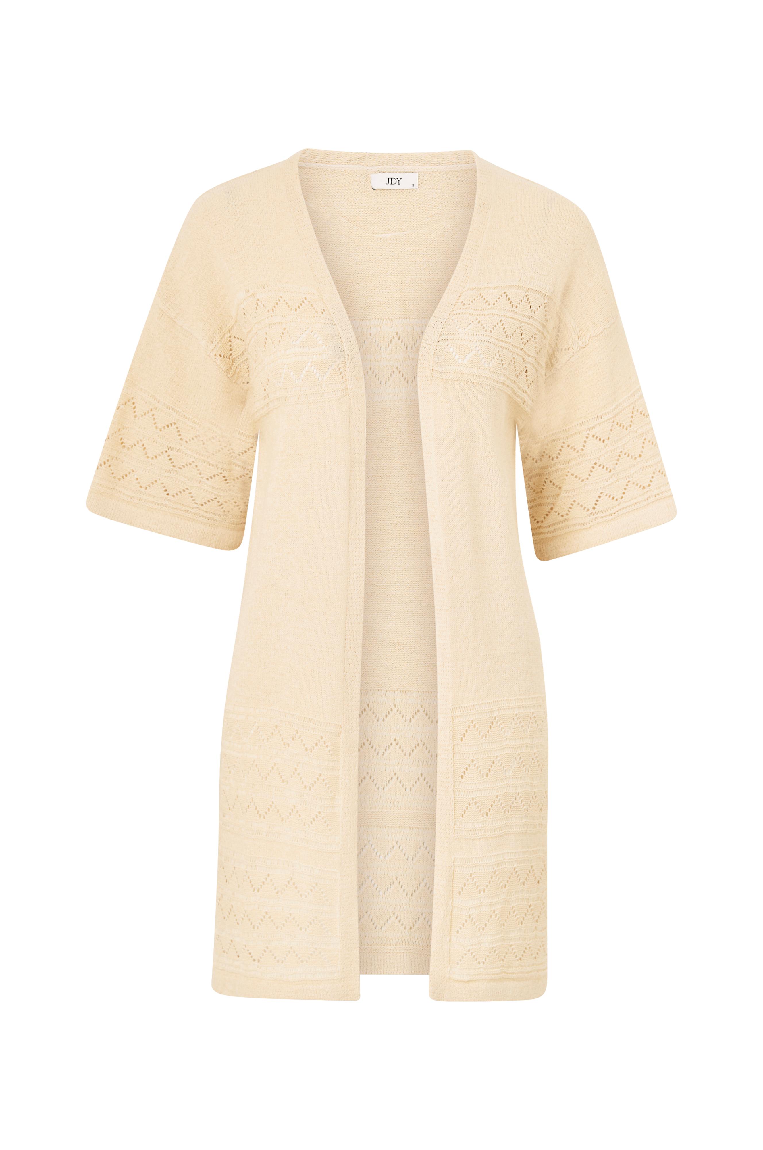 • Mønsterstrikket, lang cardigan med hulmønster• Åben model• Halvlange ærmer