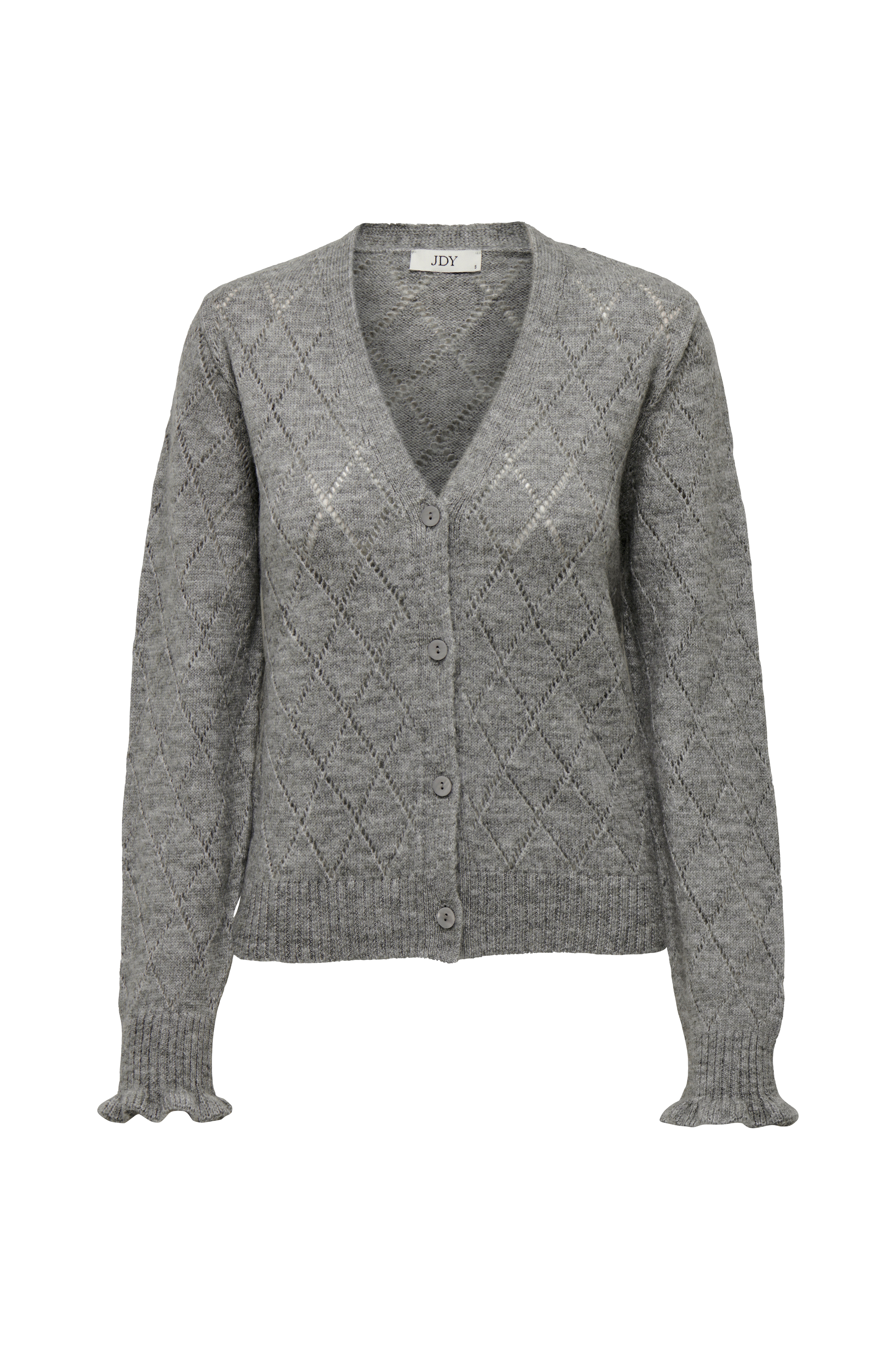 • Strikket cardigan med hulmønster• V-udskæring• Knapper• Volant ved manchetterne