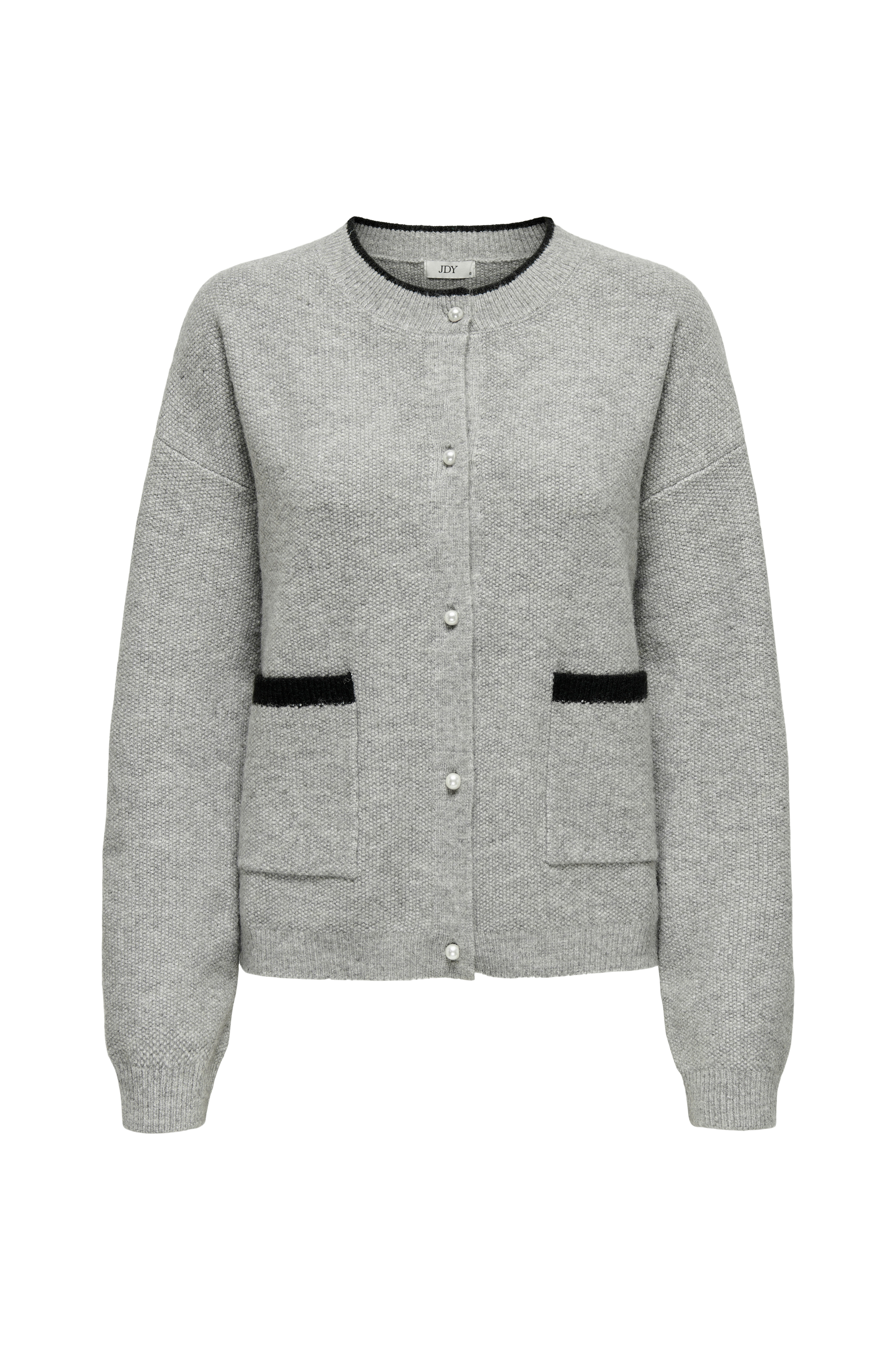 • Mønstervævet, lige model• Rund hals med ribstrik• Perleknaper• To lommer• Nedsænket skulder med langt ærme• Ribstrik ved nederste kant og ved manchetterne