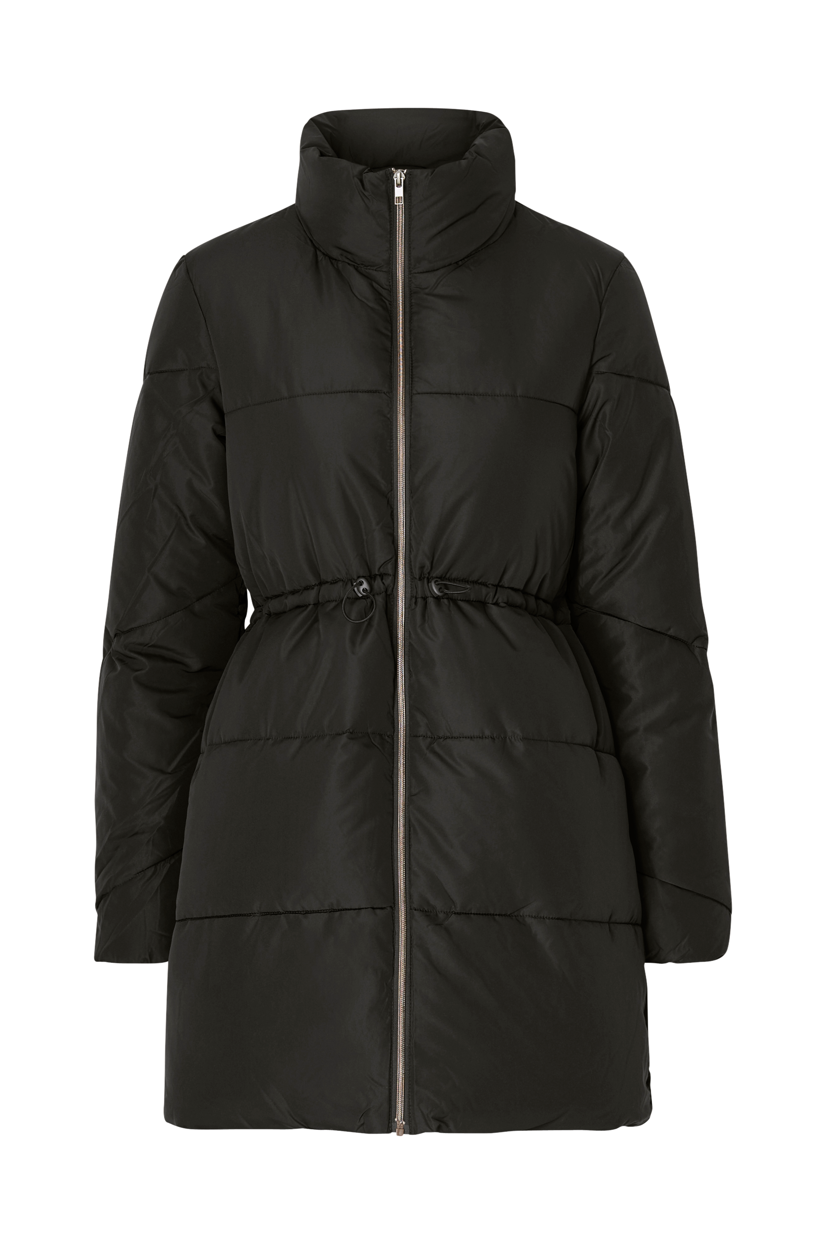 Vatteret jakke med høj krave, lynlåslukning og justerbar løbegang i taljen. Lommer i siderne. Elastik i ærmekanten. Længde 85 cm i str. S.