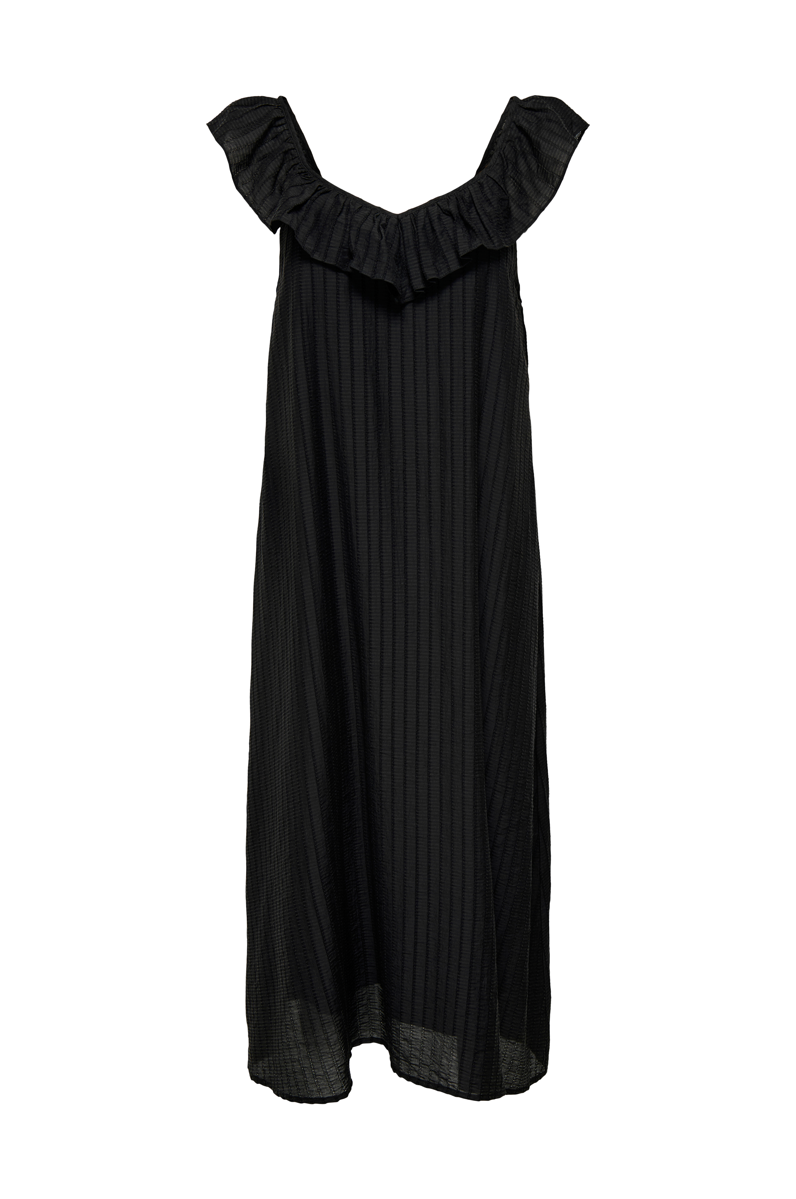 • Foret, ærmeløs kjole med løs pasform• V-formet halsudskæring• Volant på udskæringen og over skuldrene• Længde: 129 cm i størrelse S