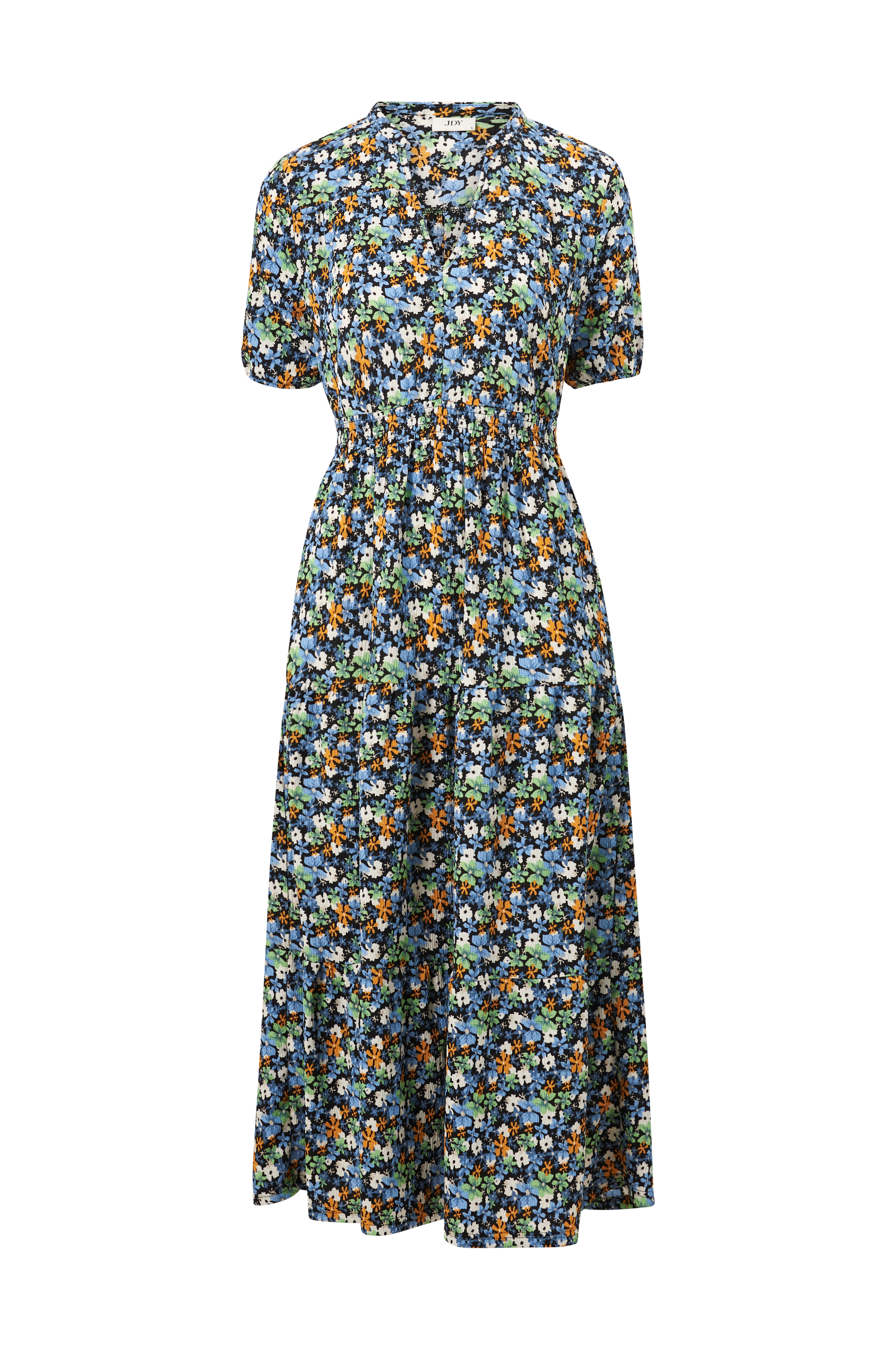 • Lang, figurformede model• V-udskæring i halsen• Kort ærme• Elastisk smock ved taljen• Nederdel med svaj med volanter• Længde: 128 cm i størrelse S