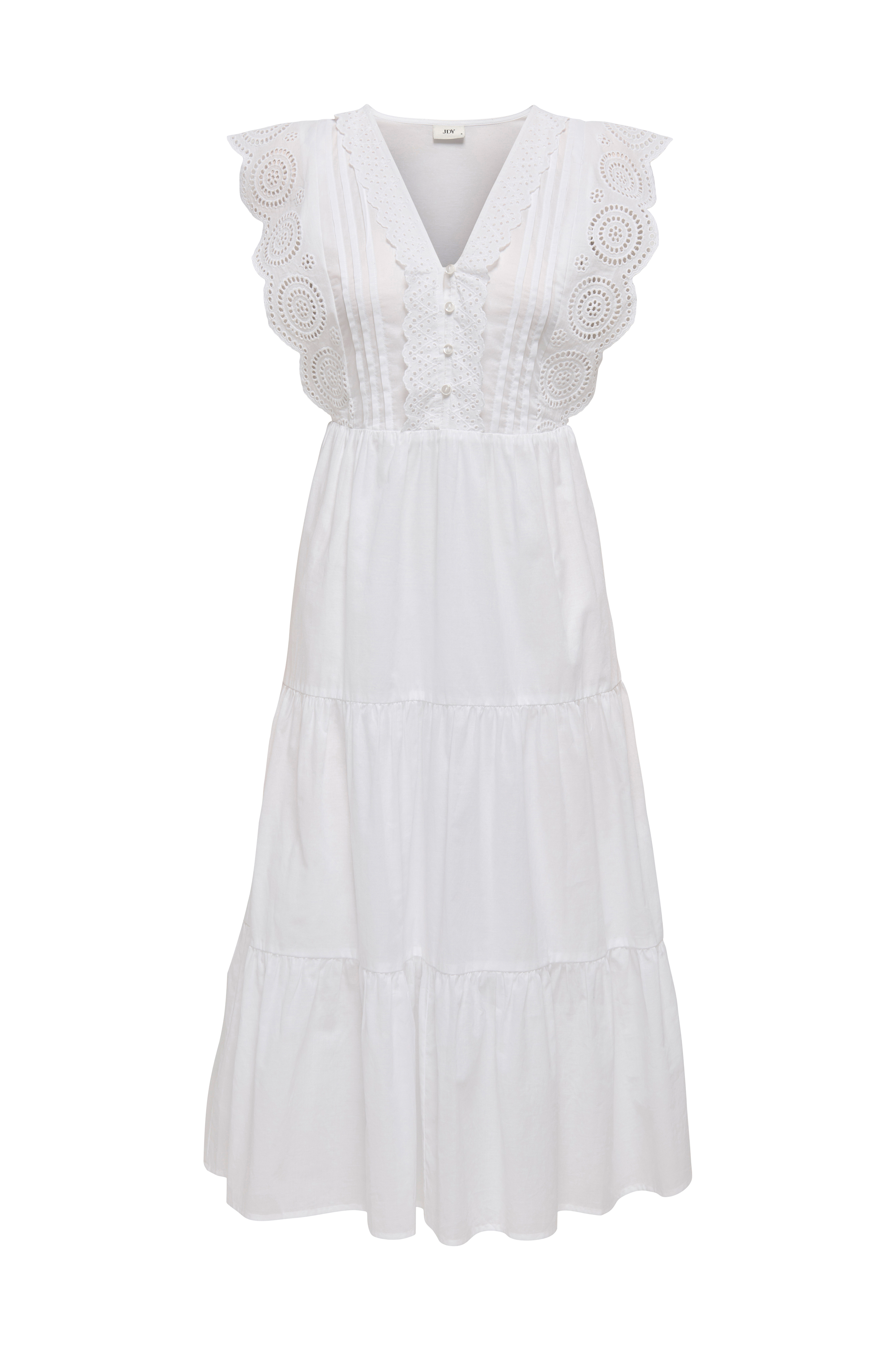 • V-formet halsudskæring med volant og dekorative knapper • Små flagrende ærmer • Hulbroderier på halsen og på ærmerne • Bølgeformede detaljer på overdelen • Skjult lynlås i siden • Foret nederdel med svaj • Længde: 120 cm i størrelse S