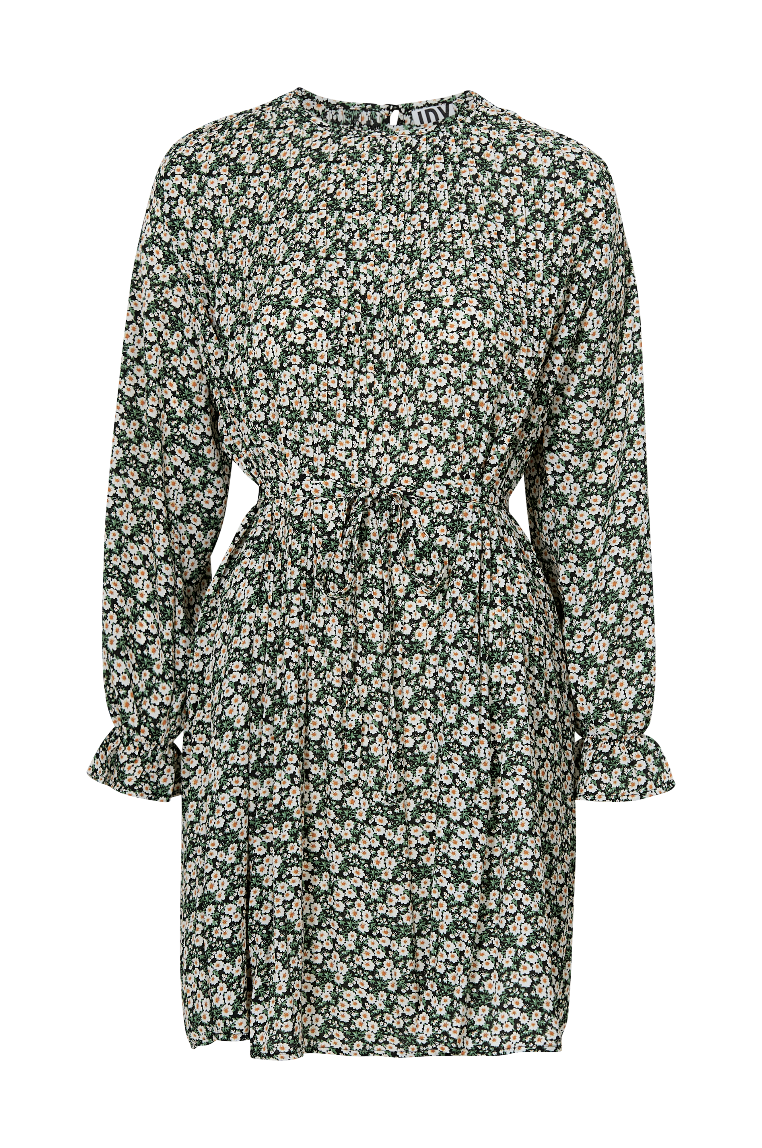 Kort kjole i vid A-formet model med bindebælte i taljen. Lange ærmer med elastik og flæse i ærmekanterne. Rund hals med slids og knap i nakken. I vævet, plisseret kvalitet. Længde ca. 93 cm i str. 36.