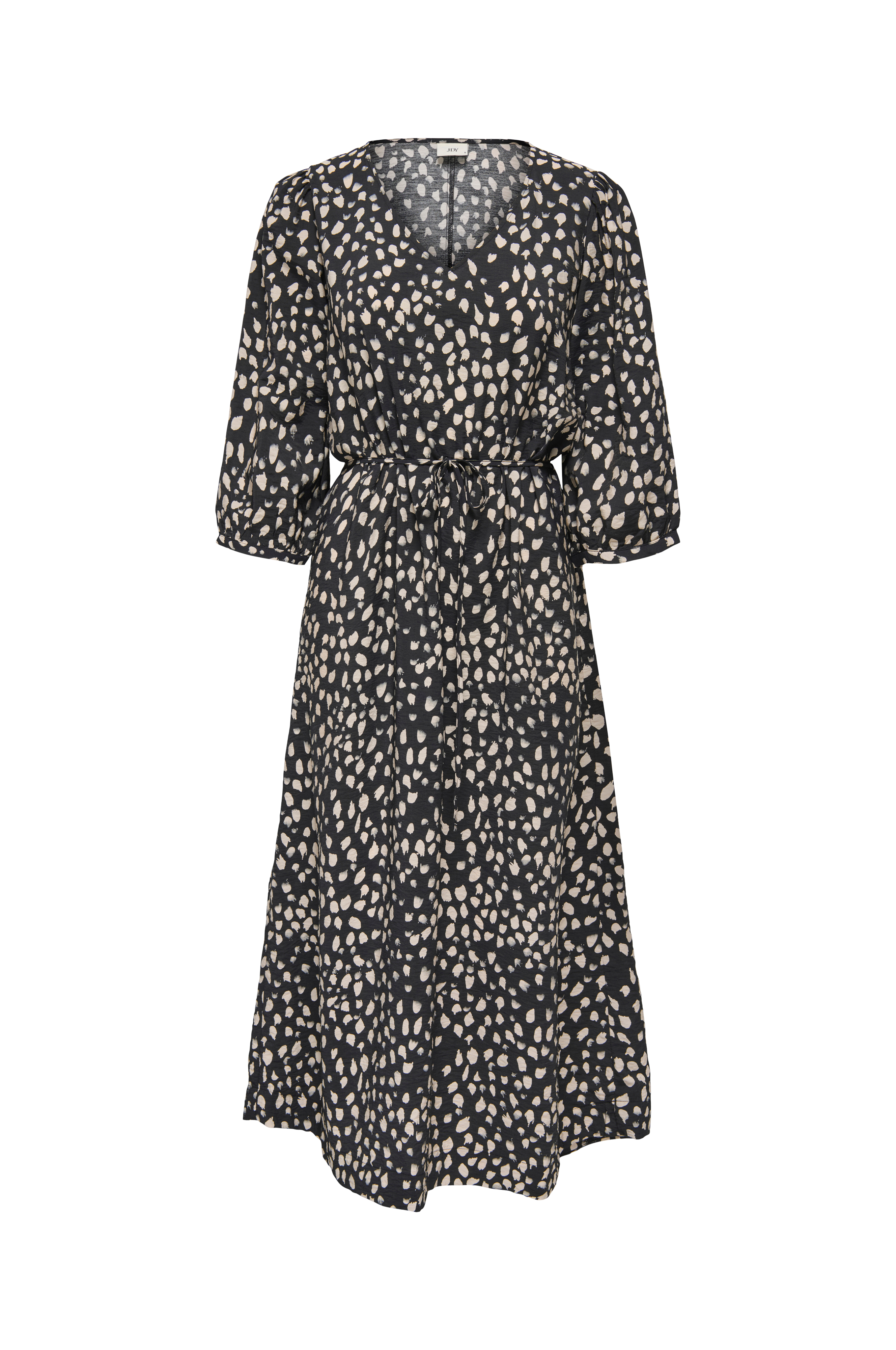 • Lang model med svaj• V-formet halsudskæring• 3/4 langt ballonærme med tynd manchet• Stropper med tyndt bindebælte ved taljen• Længde: 128 cm i størrelse S