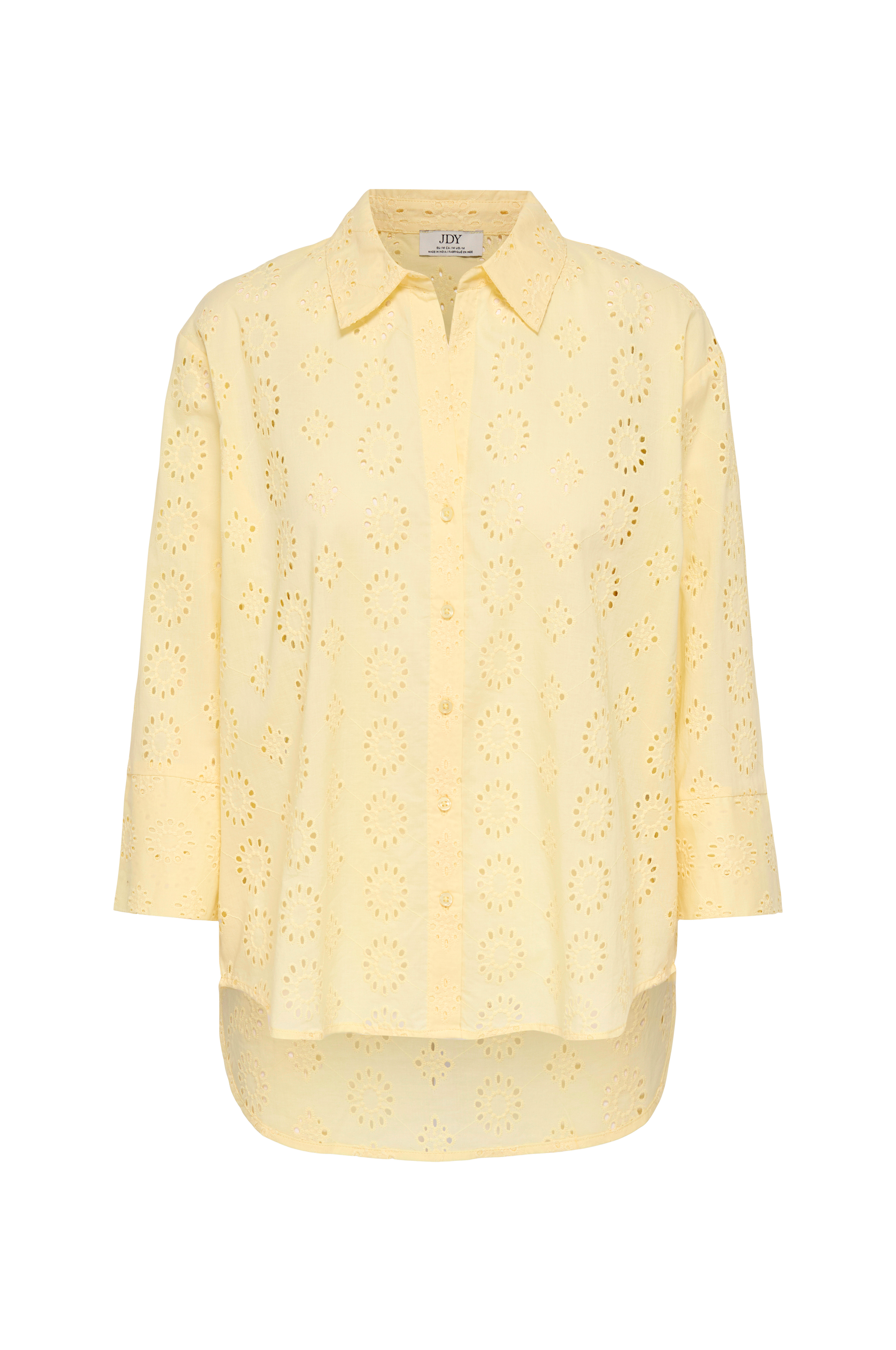 • Skjorte med hulbroderier• V-formet halsudskæring med klassisk krave• Knaplukning foran foran• 3/4 lange ærmer med høj slids ved ærmeafslutningerne• Afrundet søm med længere bagside