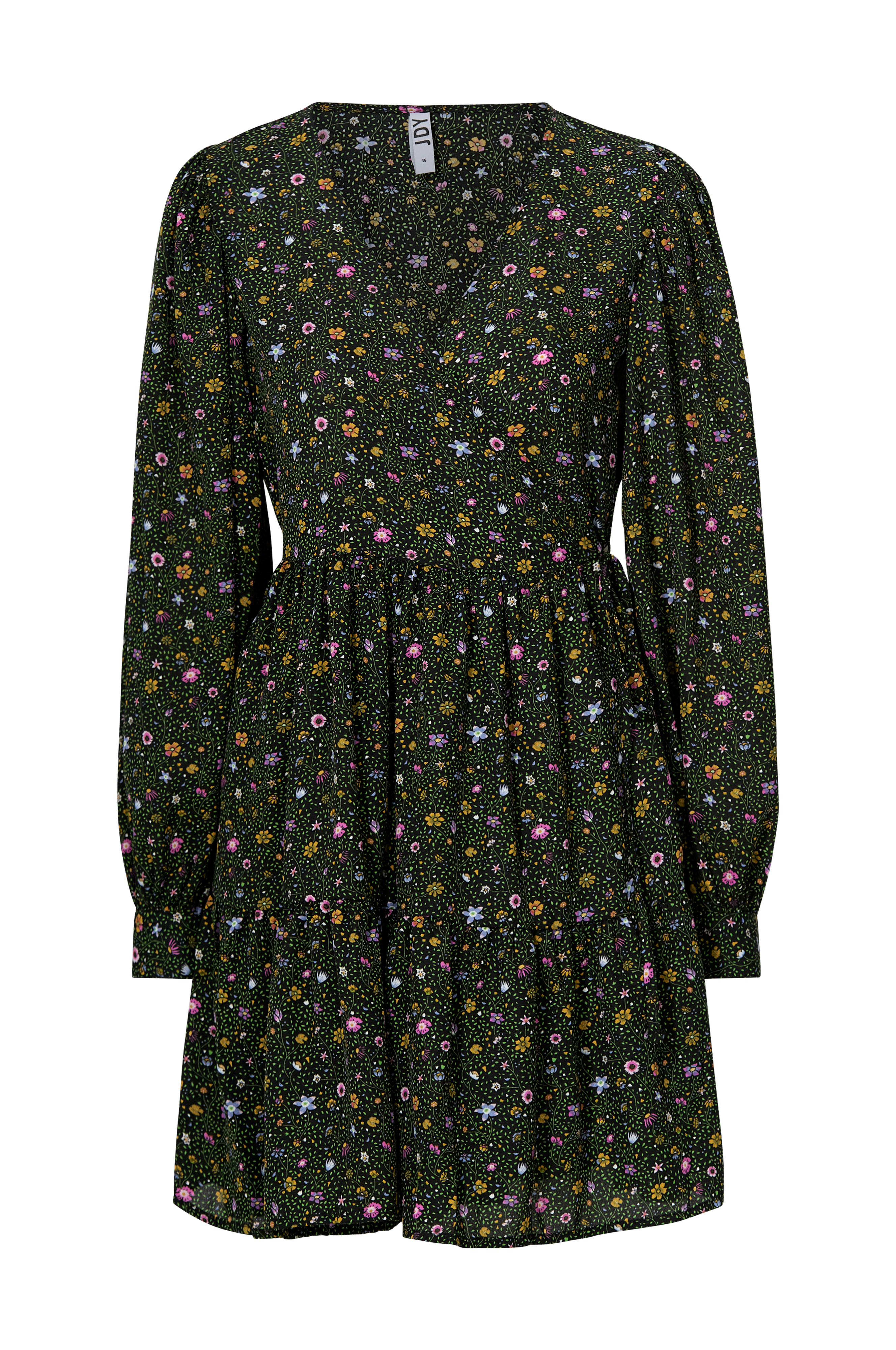 • Bindebånd ved taljen• Lange, brede ballonærmer med manchet• Volantnederdel• Længde: 90 cm i størrelse 36