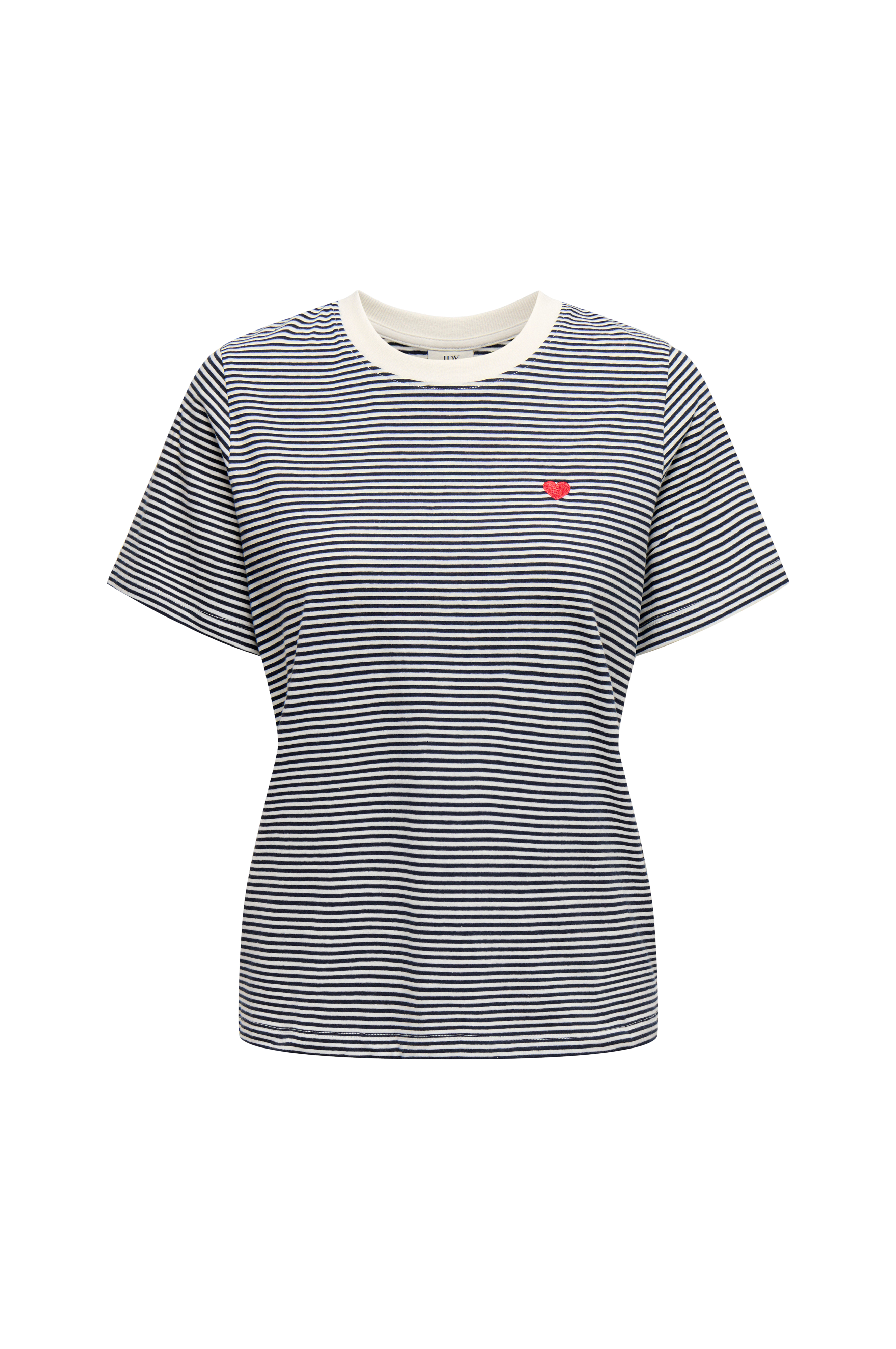 • Lille, broderet hjerte på brystet• Rund, ribbet halsudskæring• Korte ærmer