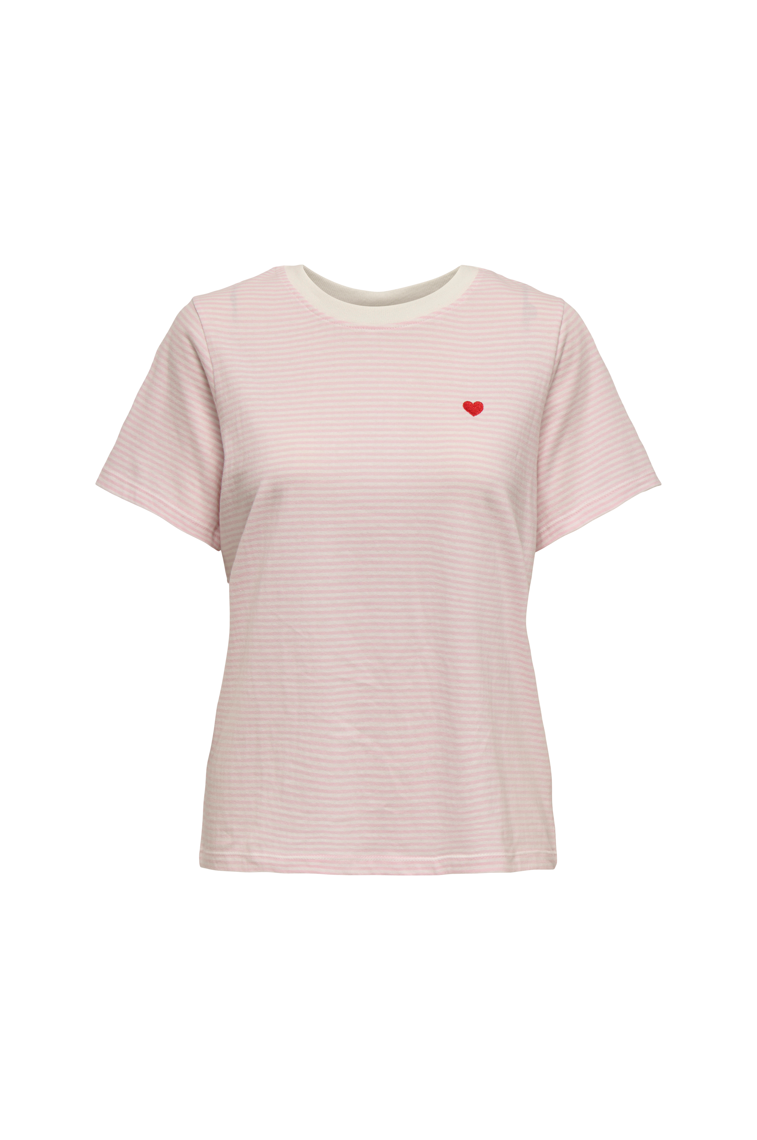 • Lille, broderet hjerte på brystet• Rund, ribbet halsudskæring• Korte ærmer