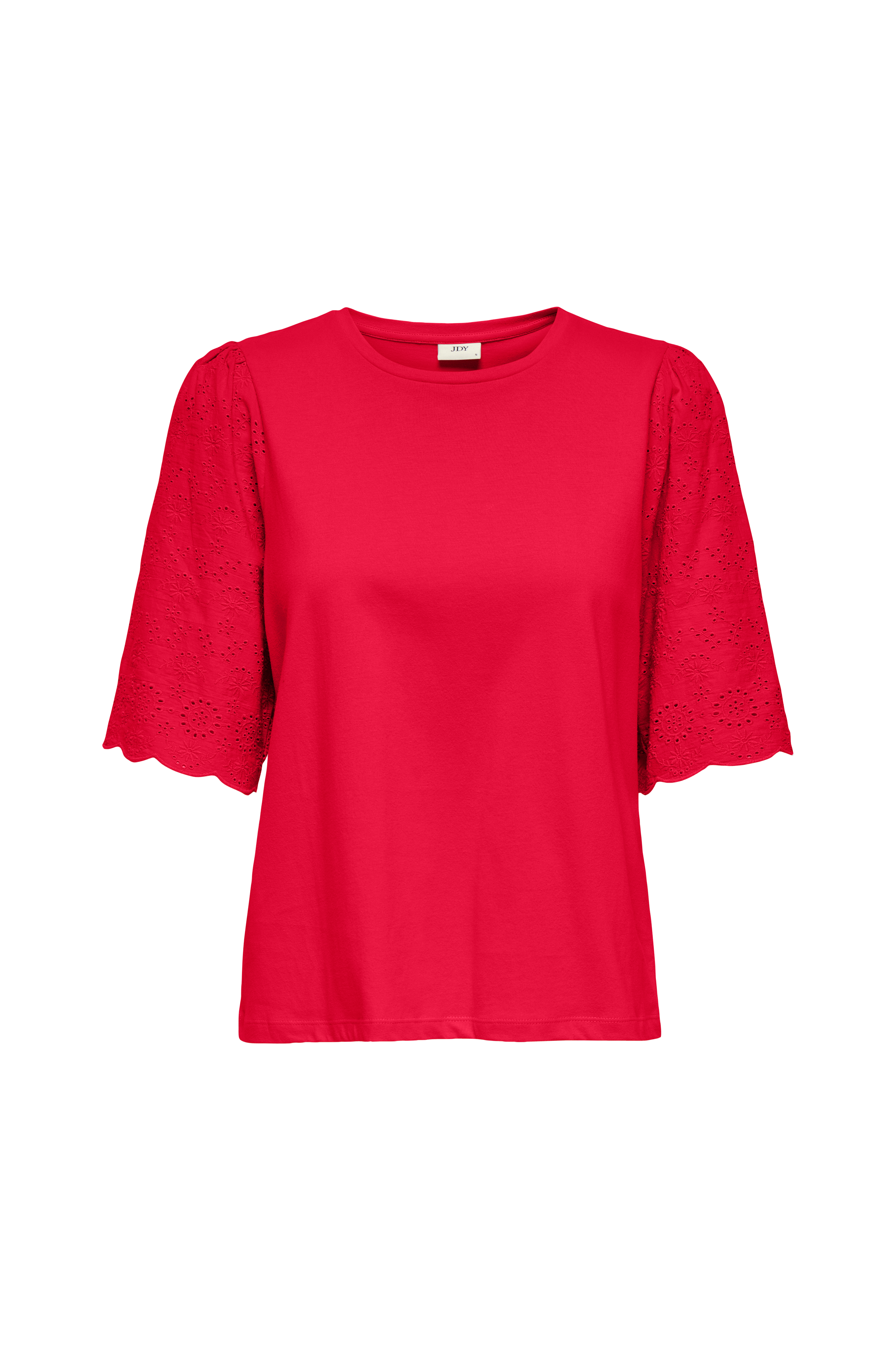 • Model i jersey• Kort ærme med hulbroderier• Rund halsringning