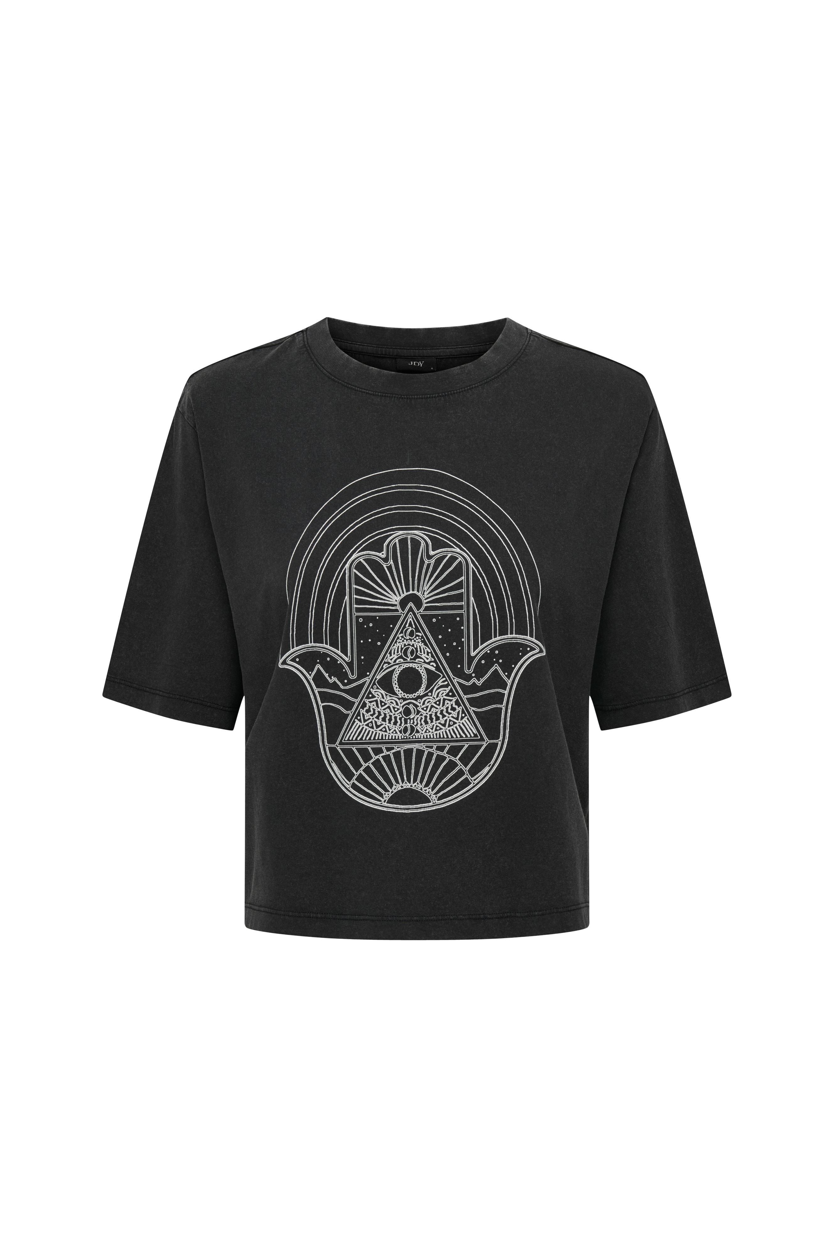 • Lige, bred model• Rund hals• Nedsænket skulder med kort ærme• Glitrende tryk foran