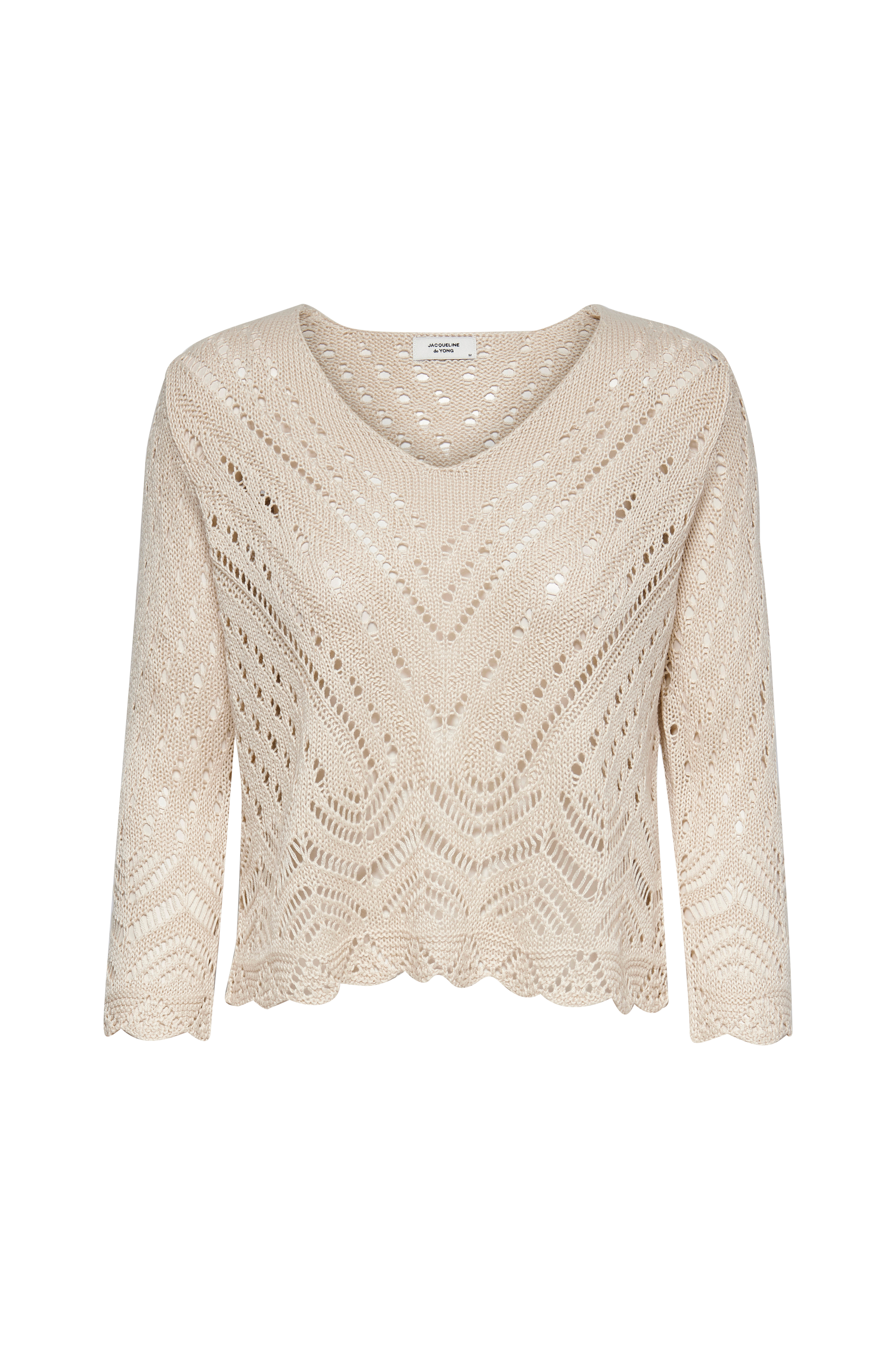 • Bred, lige, mønsterstrikket model• Blød v-udskæring• 3/4 langt ærme• Bølget kant nederst og ved manchetterne