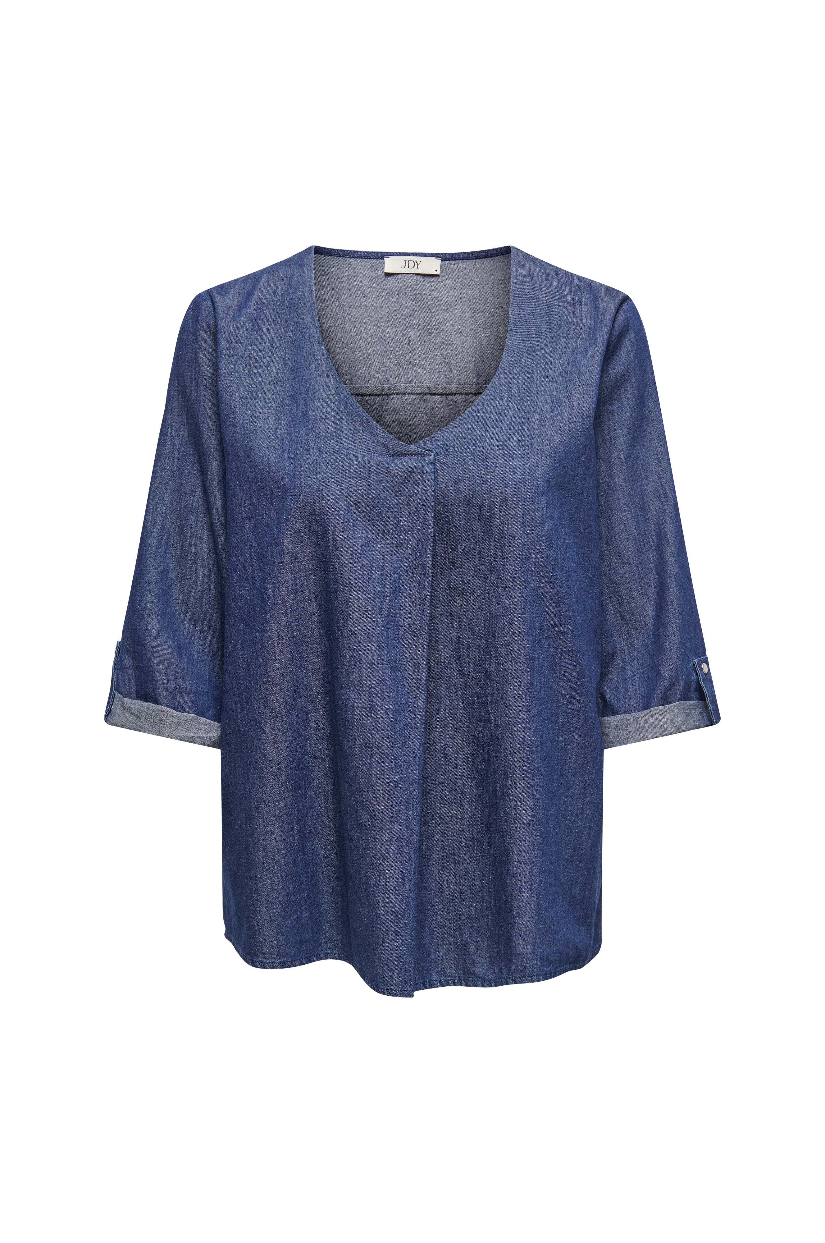 • Lige model i blødt denim• V-formet halsudskæring• Halvlangt ærme med oprullet og flap ved manchetterne• Bokslæg på brystet