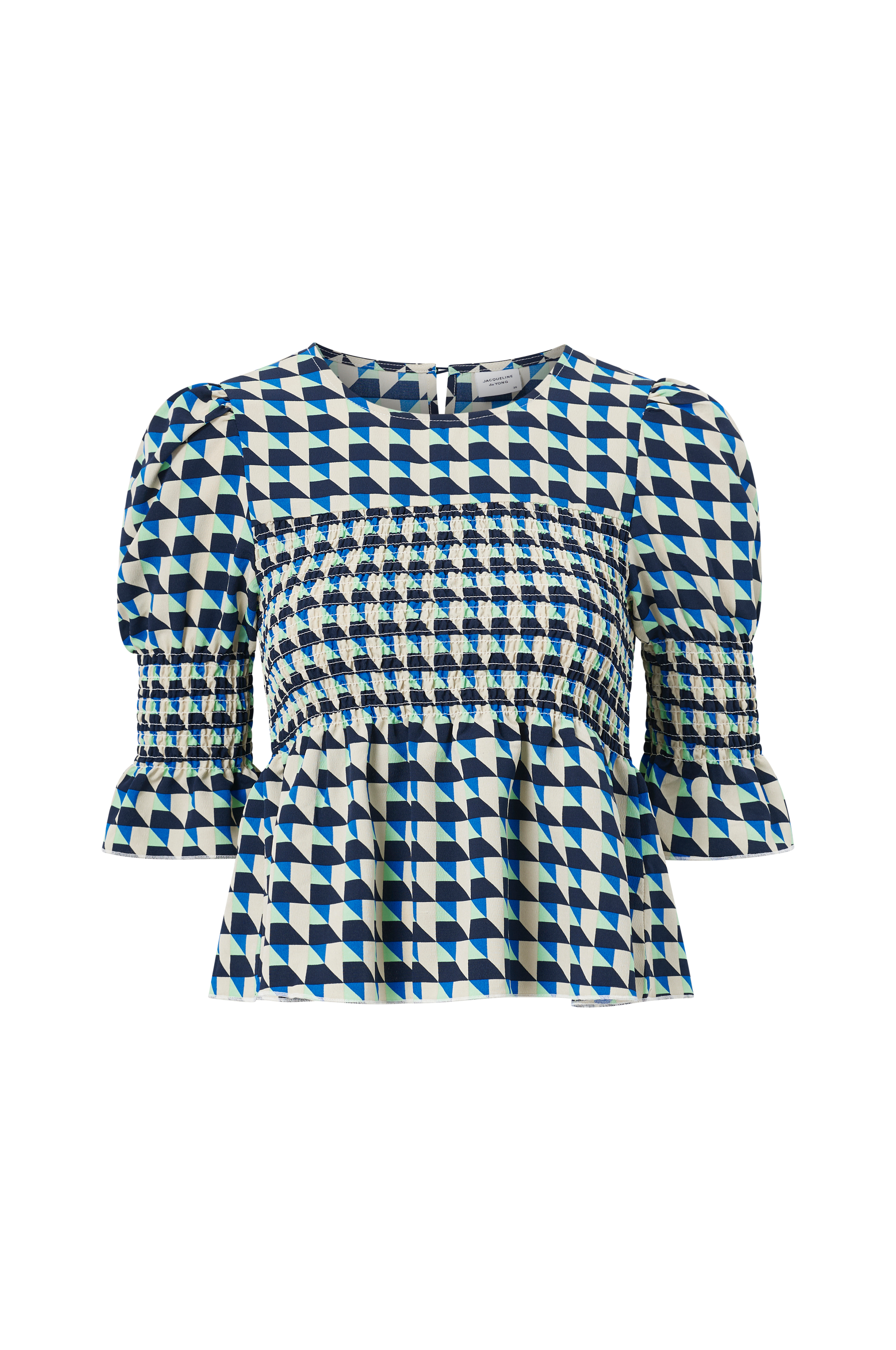 Top i figursyet model med bred smockelastik over brystet og ryggen samt på ærmet. Rund hals med slids og knap i nakken og pufærme med rynkning ved skulderen.