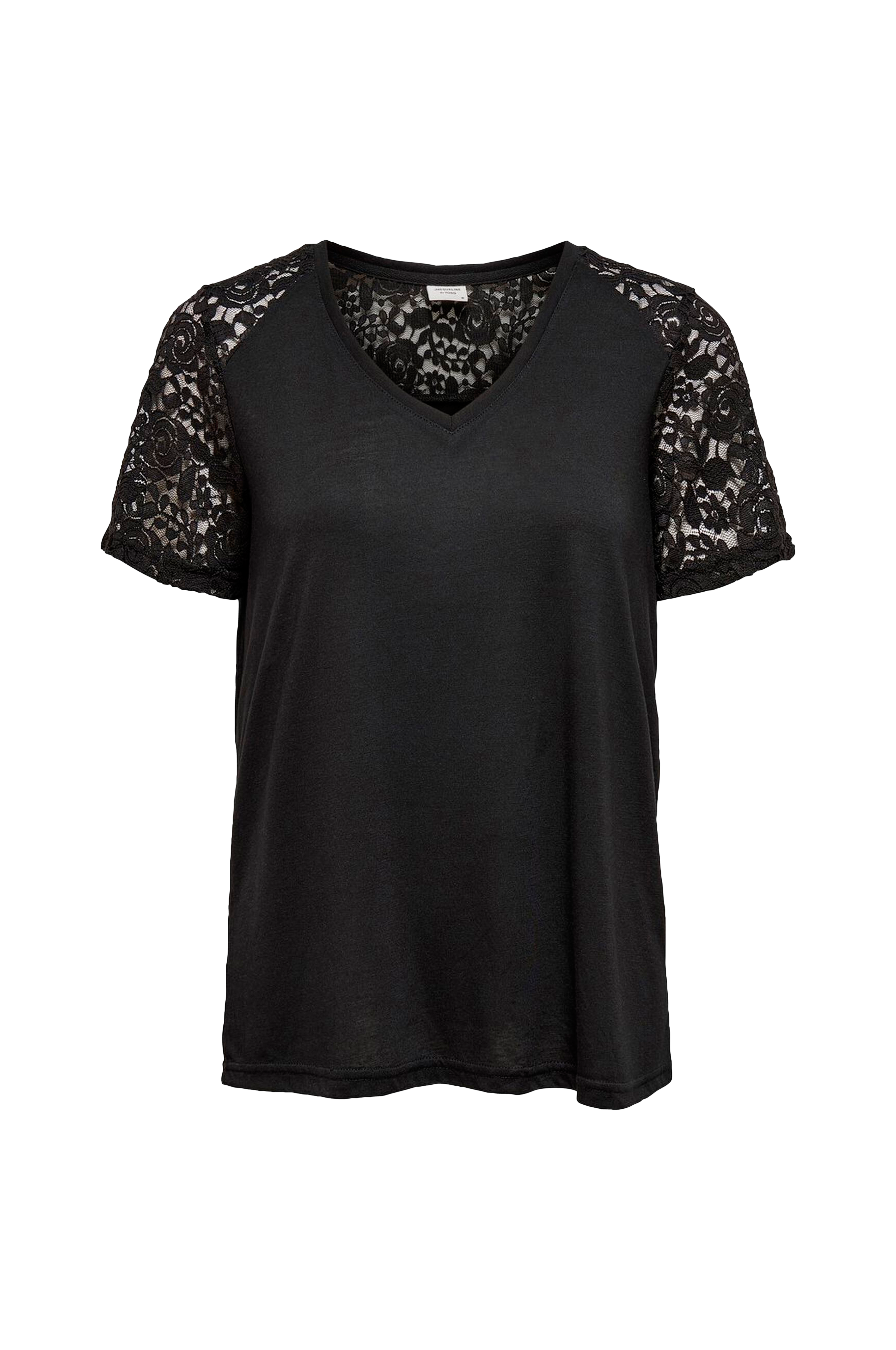 Kortærmet top i blød jersey med V-udskæring foran. Blondebærestykke og blondeærmer.