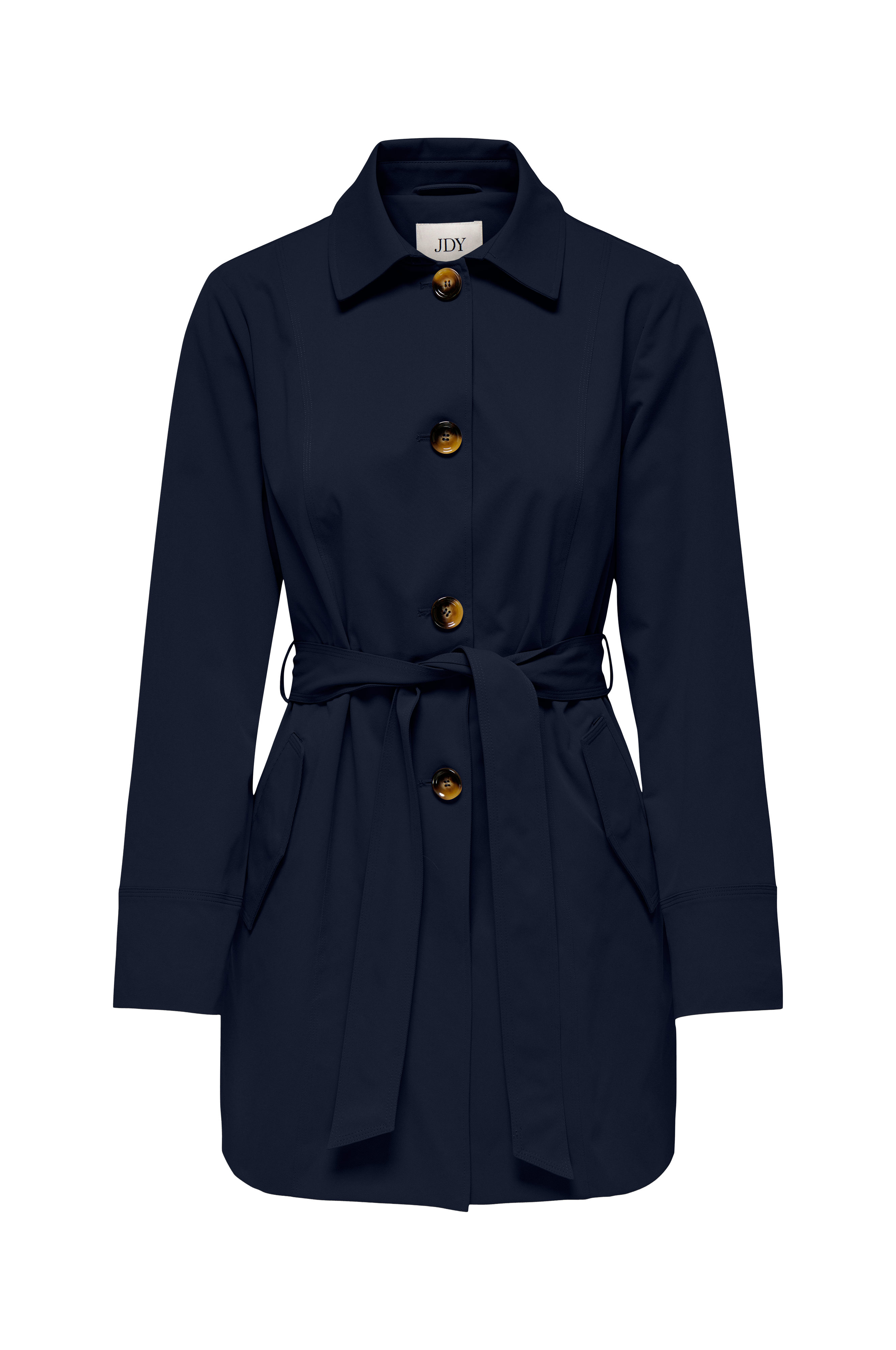 • Enkeltradet model med aftageligt bindebælte ved taljen• To lommer med trykknapslukning• Slids nede bagved• Løstsiddende linning bagpå• Længde: 83 cm i størrelse S