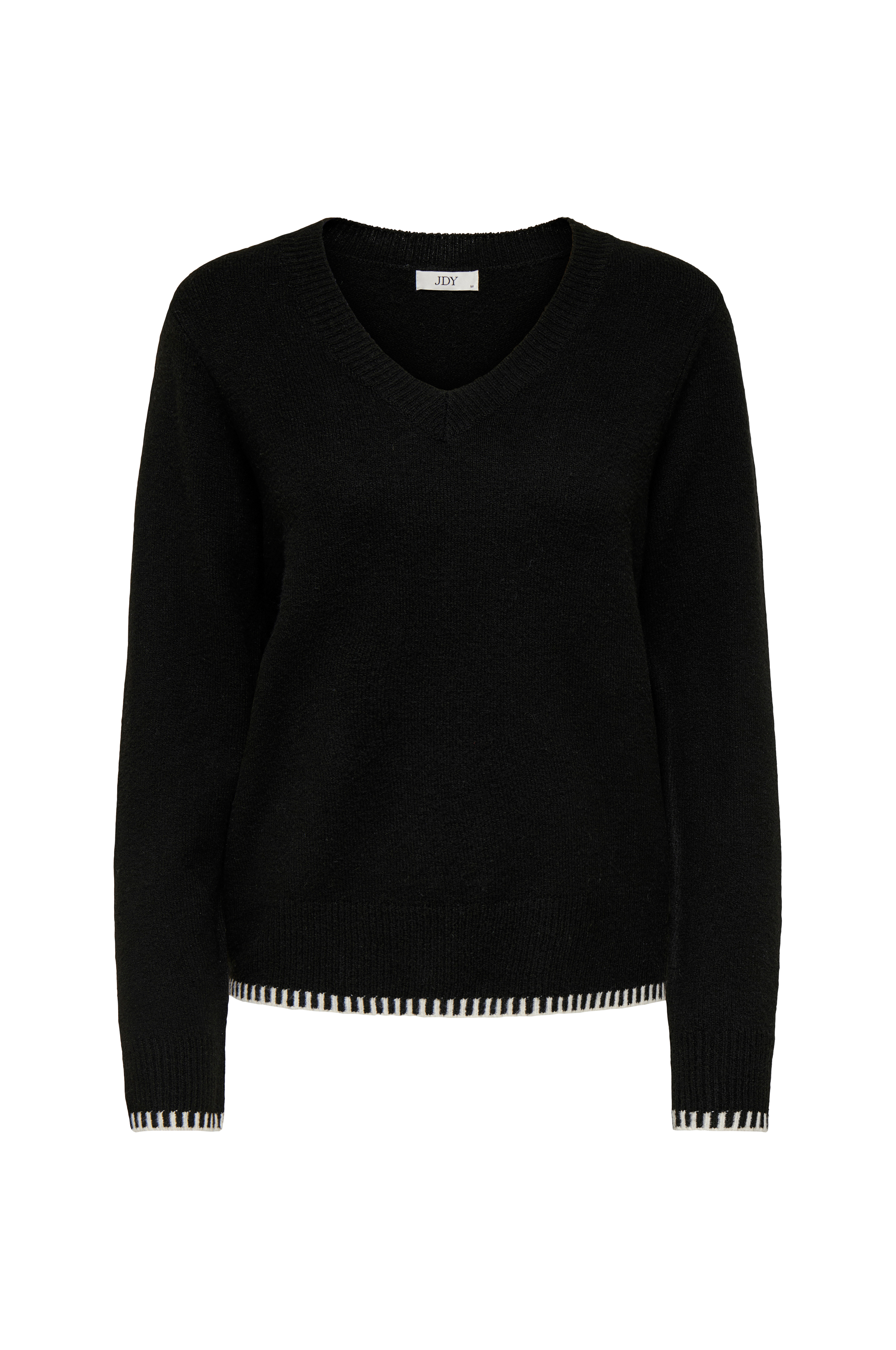 • Lige, mønsterstrikket model• V-udskæring med ribkant• Langt ærme• Ribstrik ved manchetterne og nederst