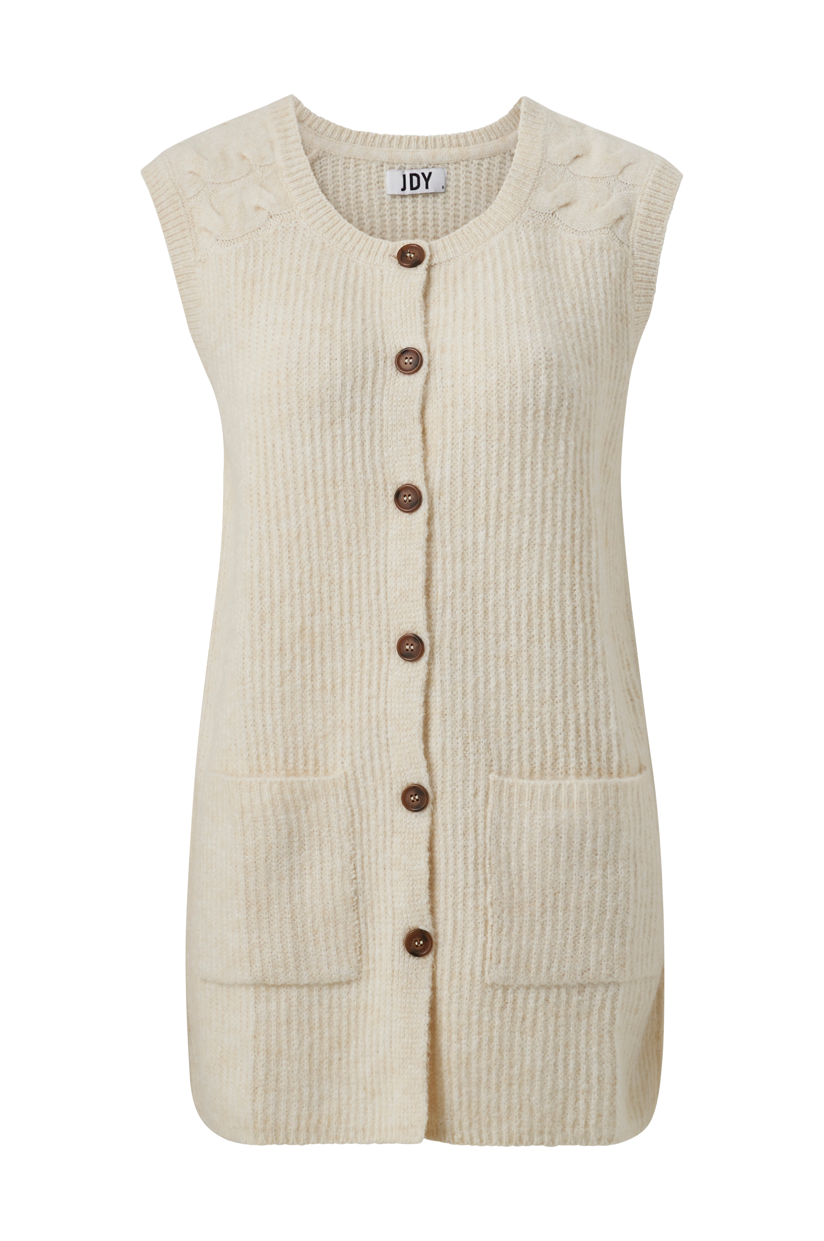• Strikket vest • Kabelstrikning på skuldrene • Knapper • To lommer • Ribkanter omkring ærmeåbningerne og nederst • Længde: 79 cm i størrelse S • Produktet indeholder genindvundet materiale, som genbruges for at reducere mængden af affald samtidigt med at der ikke anvendes nye ressourcer.