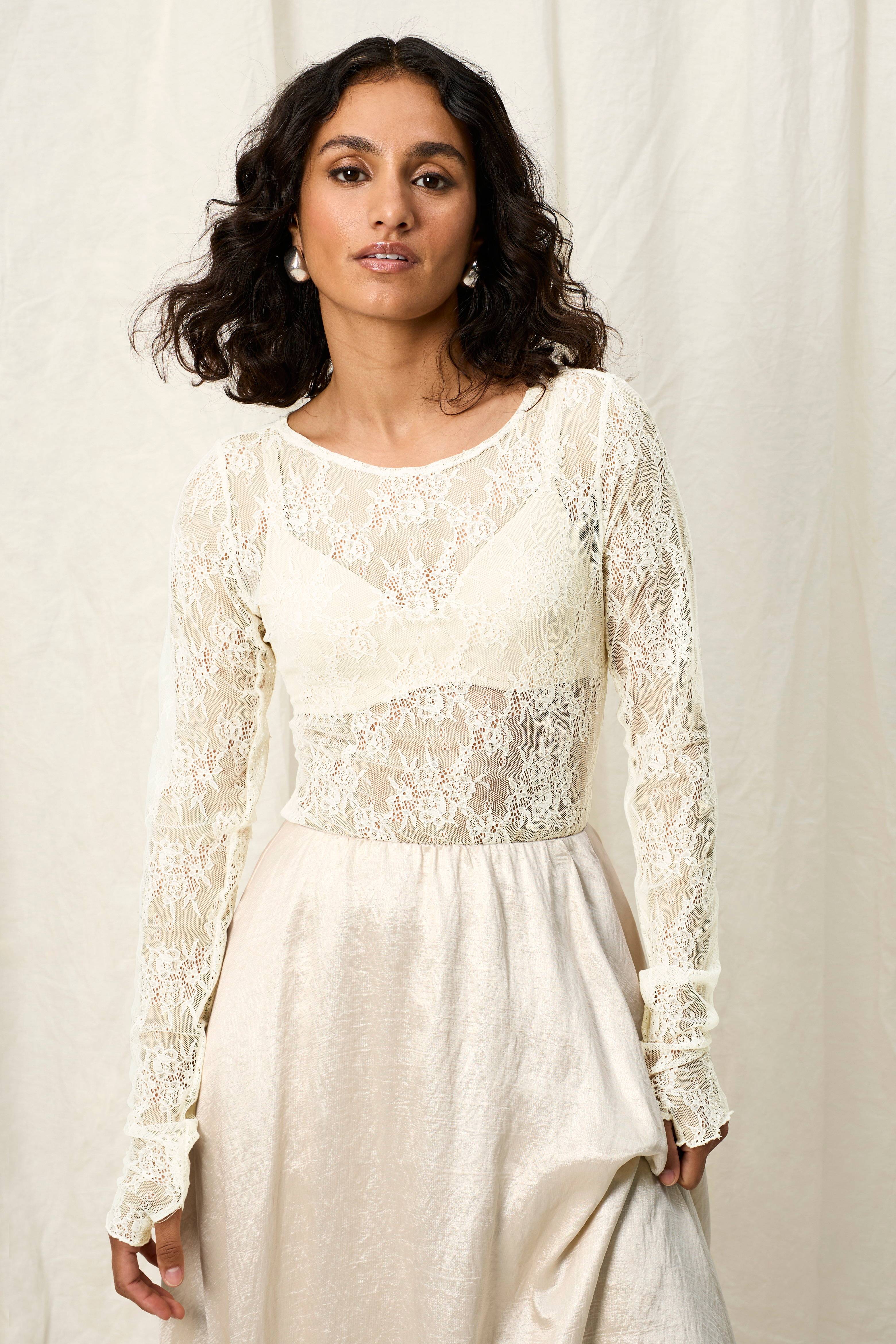 • Transparent model i blonde• Bred halsudskæring• Ekstra langt ærme• Foret skridt med trykknapper