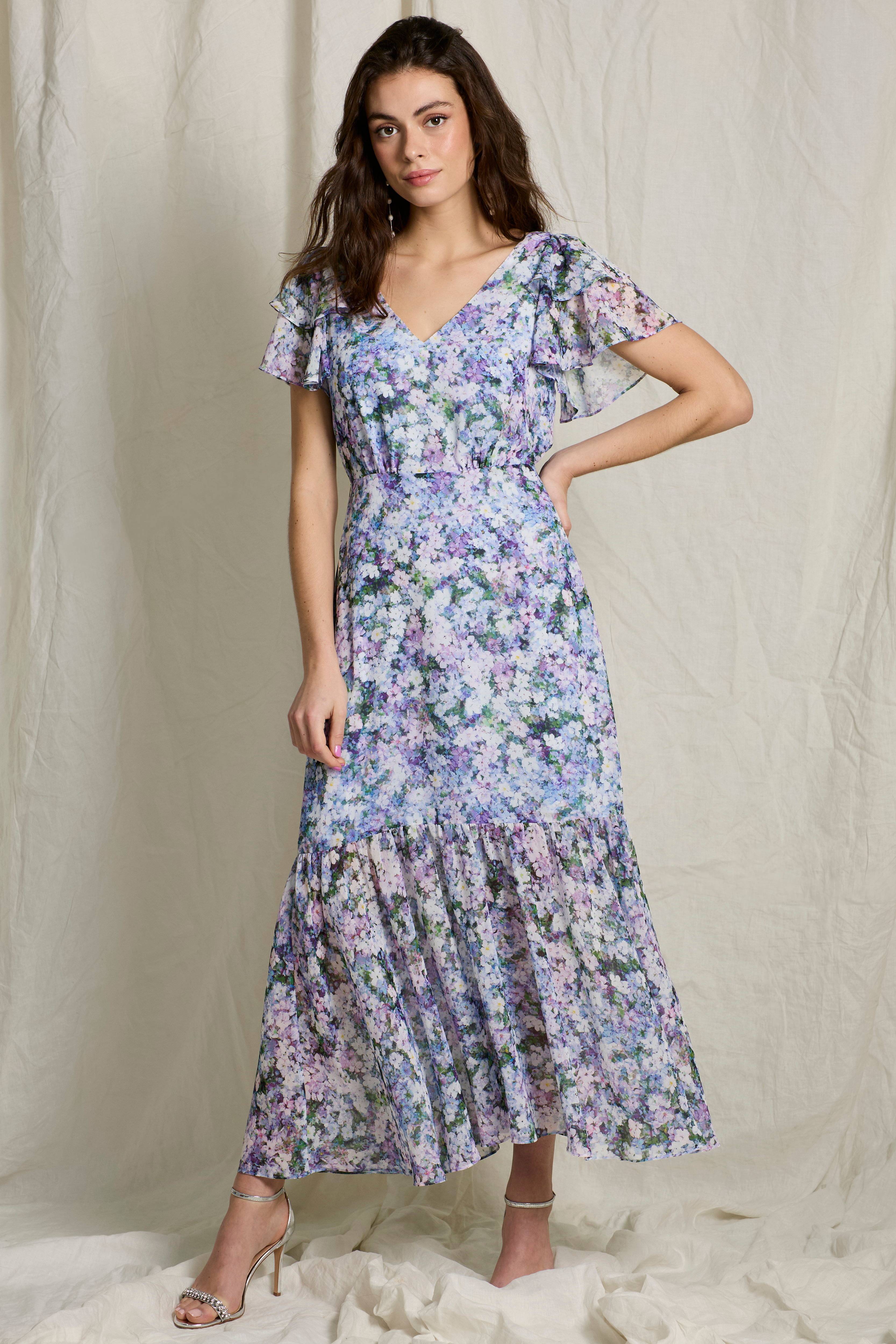 • Maxi kjole med svaj• V-udskæring i halsen og i nakken med tynde bindebånd bagpå• Kort, dobbelt flagrende ærme• Markeret talje med elastik bagpå og tyndt bindebælte• Bred volant ved nederste kant• Foret• Længde: 136 cm i størrelse 36