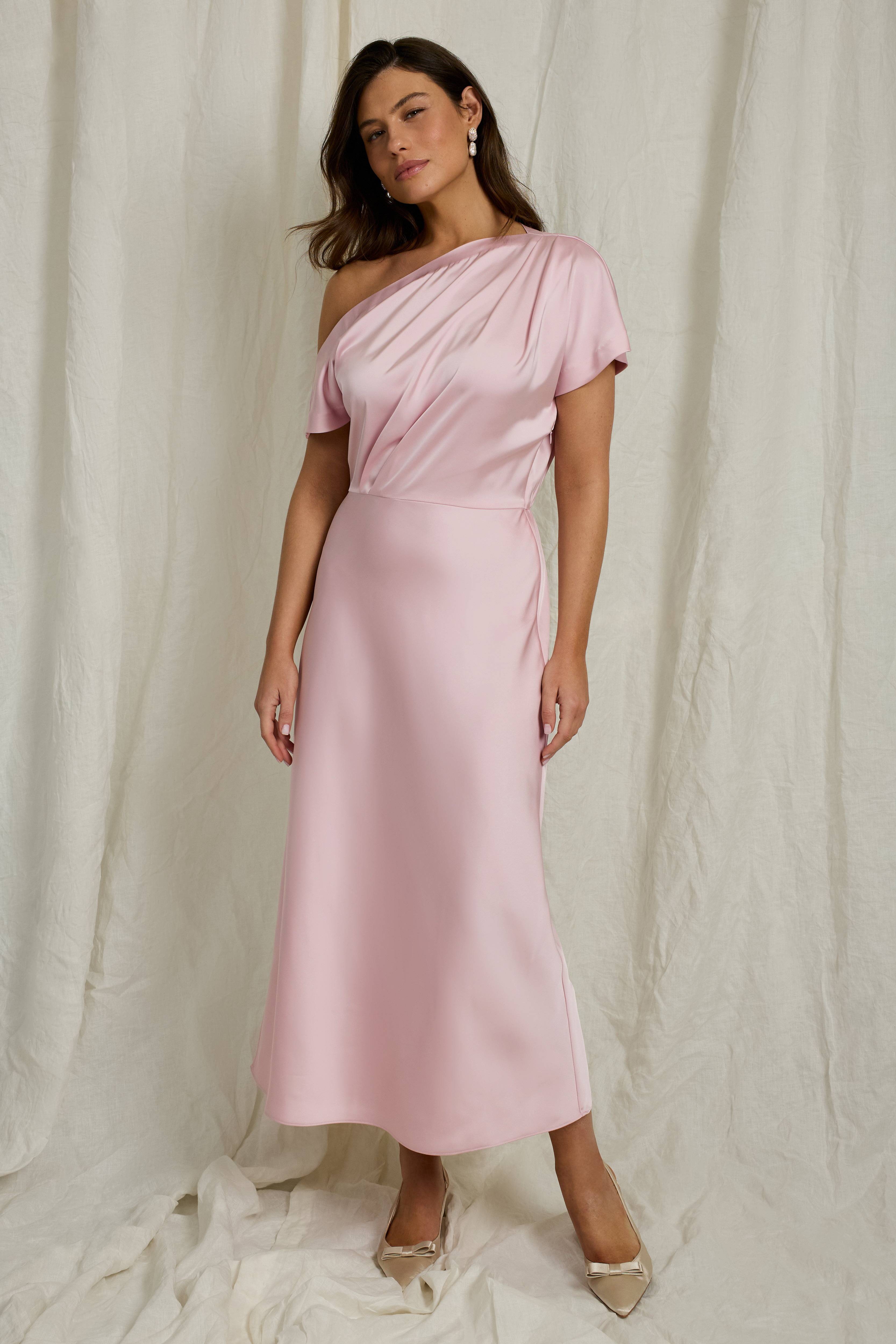 • Lang, festlig model i satin• Asymmetrisk pasform på toppen med lagdelt læg på en skulder og kort ærme• Defineret talje med læg foran og elastisk bånd bagpå• Længde: 140 cm i størrelse 36