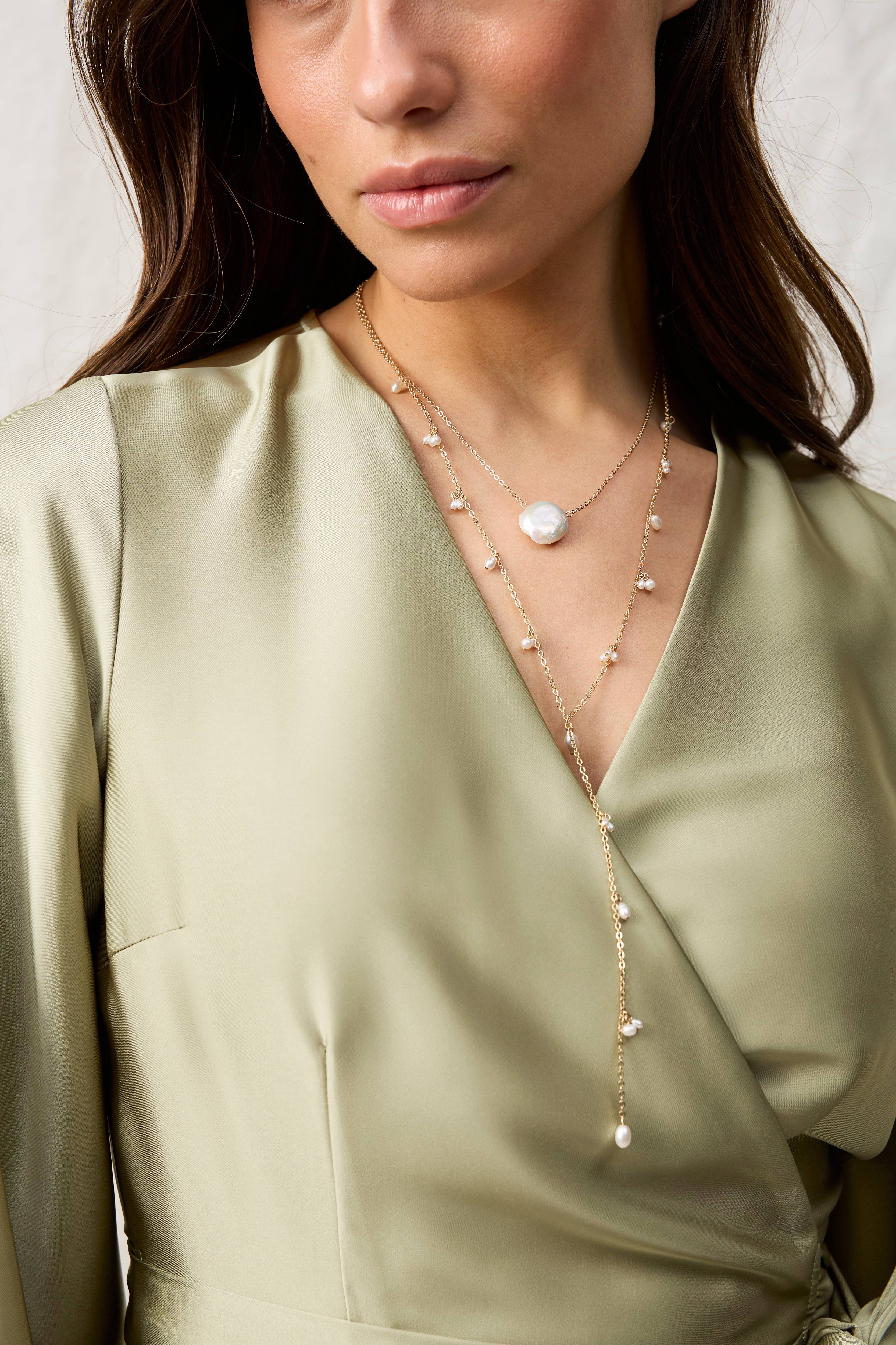 • En kort halskæde• En længere halskæde• Fremstillet af guldfarvet stål med ferskvandsperler og perler i akryl