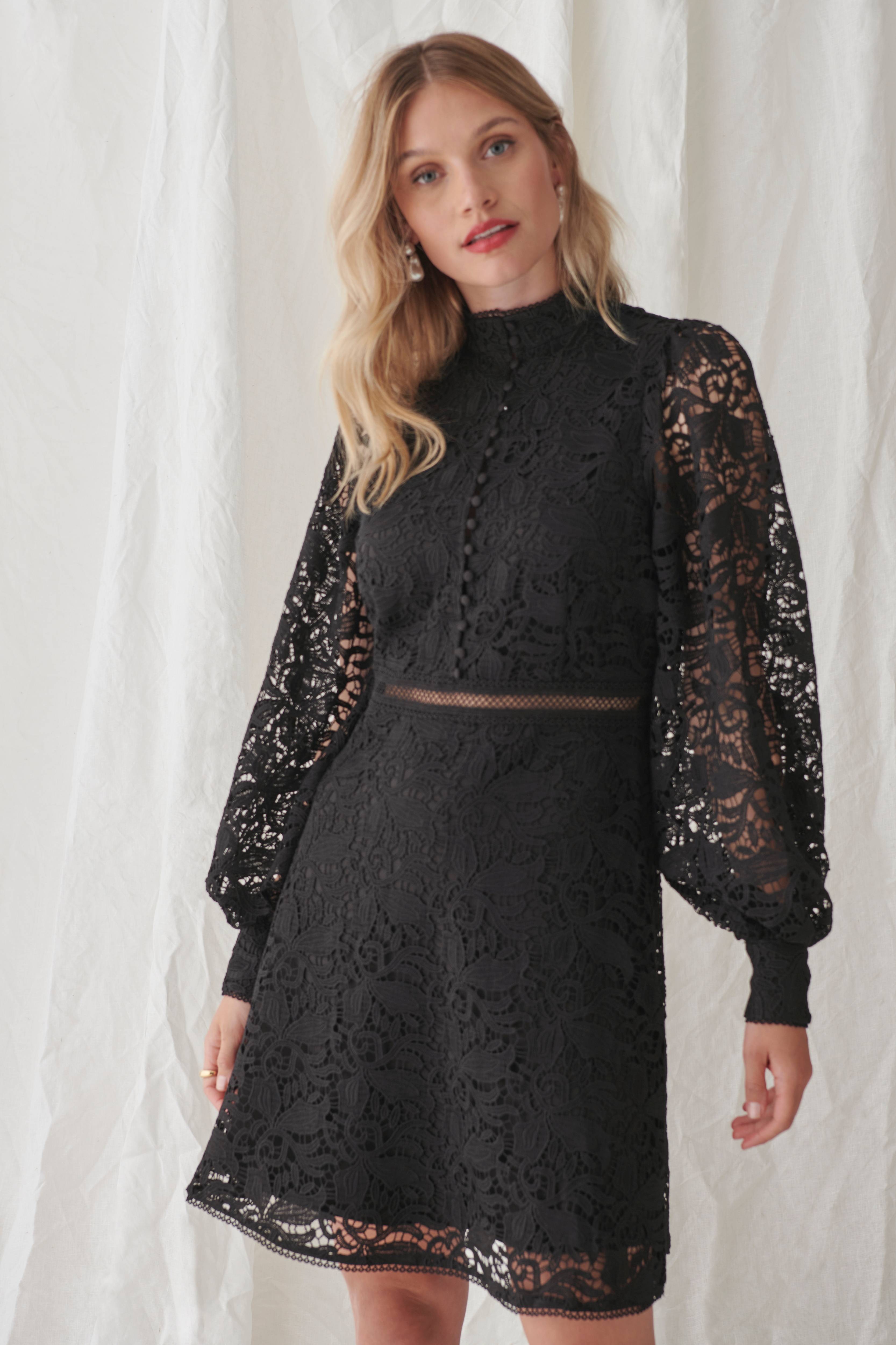 • Figurformede model i blonde• Høj krave• Knapstolpe med beklædte knapper foran• Markeret talje• Bredt ballonærme med manchet ved manchetterne• Længde: 94 cm i størrelse S