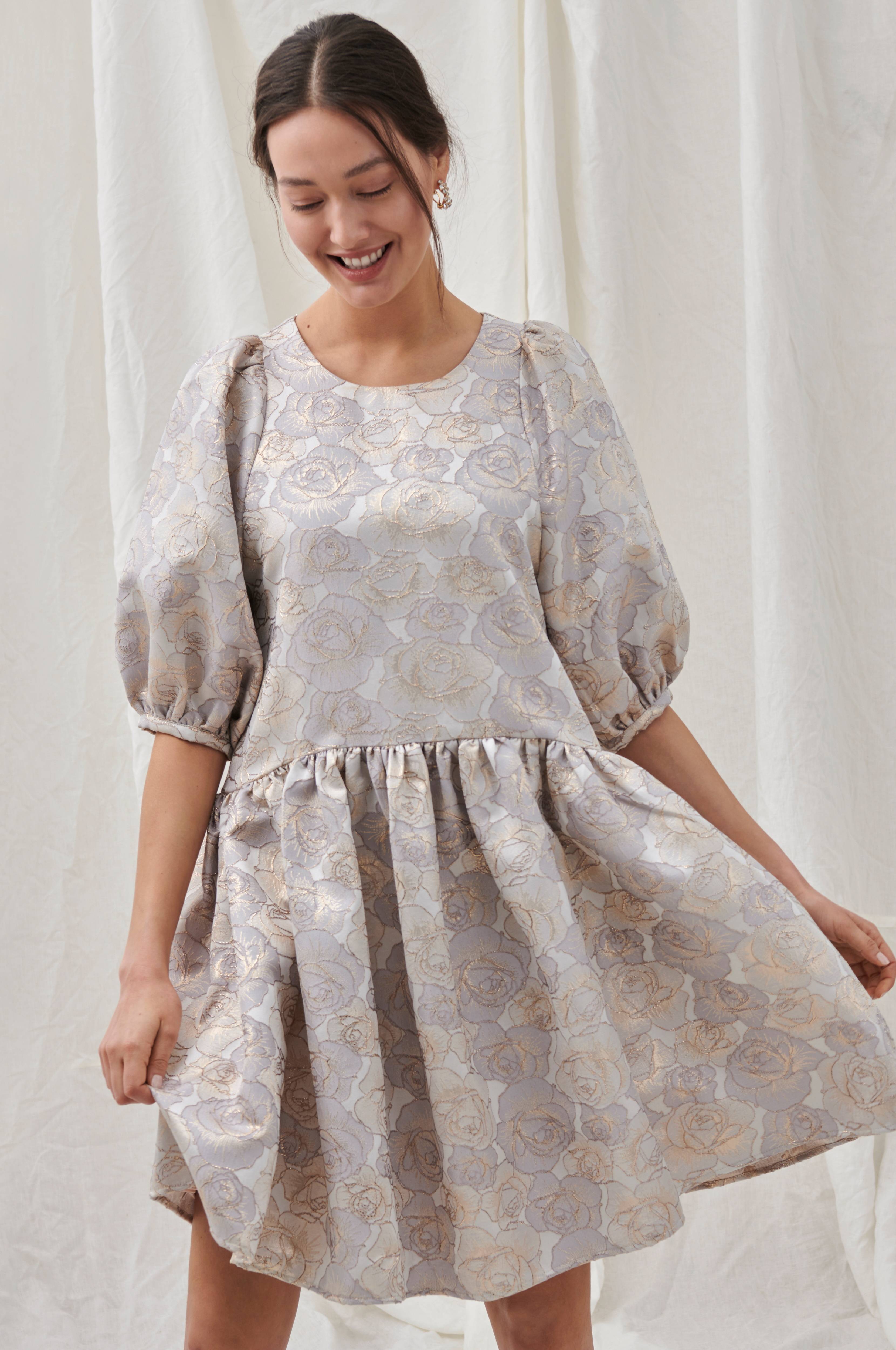 Figursyet oversizemodel i jacquardvævet kvalitet med glitrende mønster. Afskæring på hoften med vidde i underdelen og rund hals med slids og knap i nakken. Halvlangt pufærme med rynkning ved skulderen og lille påsyet kant i ærmekant. Vævet for. Længde ca. 97 cm i str. S.