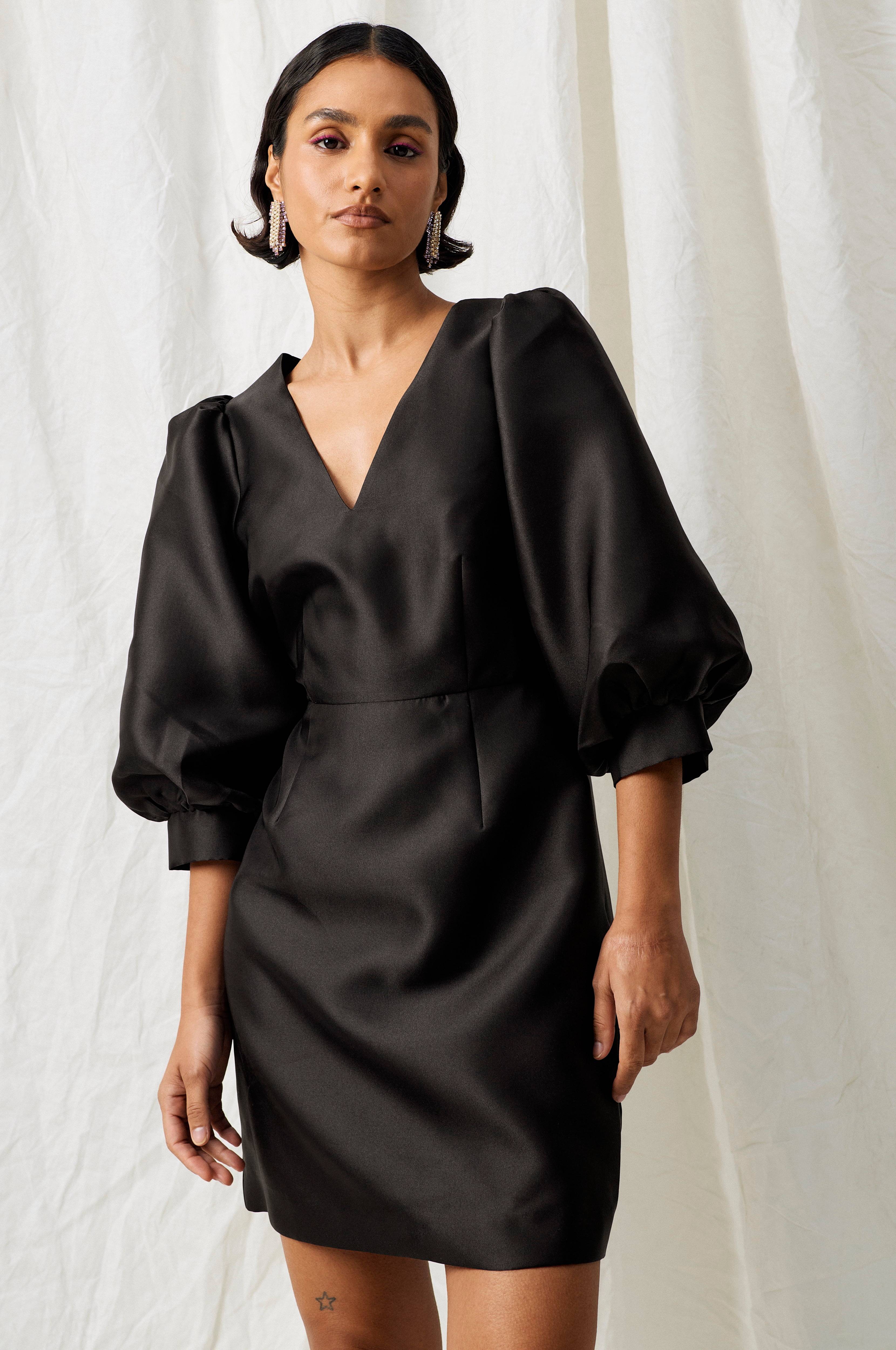 • Festkjole i satin• V-udskæring• 3/4 lange, voluminøse ballonærmer• Elastisk bånd bagpå ved taljen• Foret• Længde: 88 cm i størrelse 36