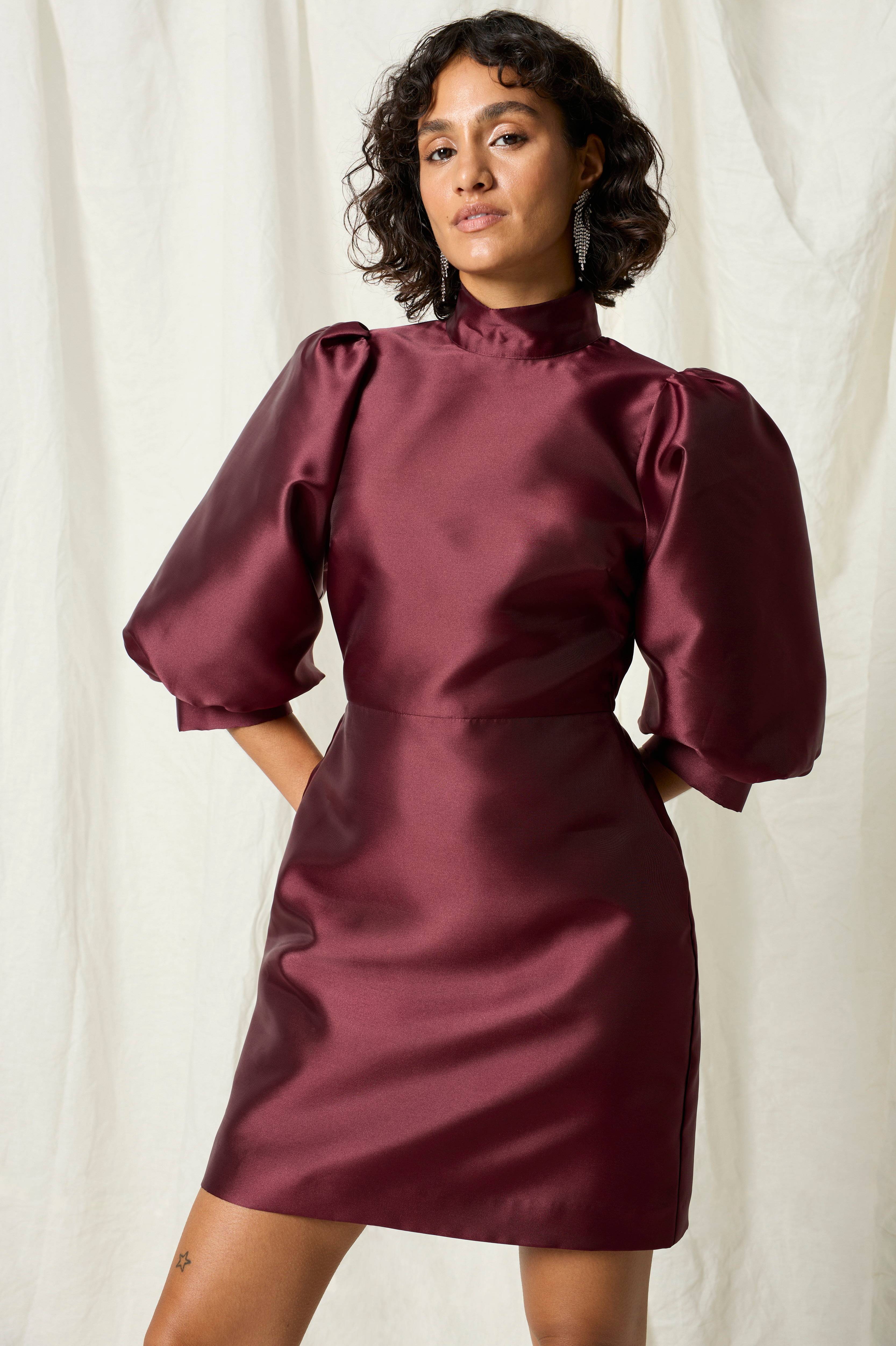 • Figurformede model• Halvhøj krave med beklædte knapper i nakken• Ekstra bredt, halvlangt ballonærme• Defineret talje• Foret• Længde: 89 cm i størrelse 36