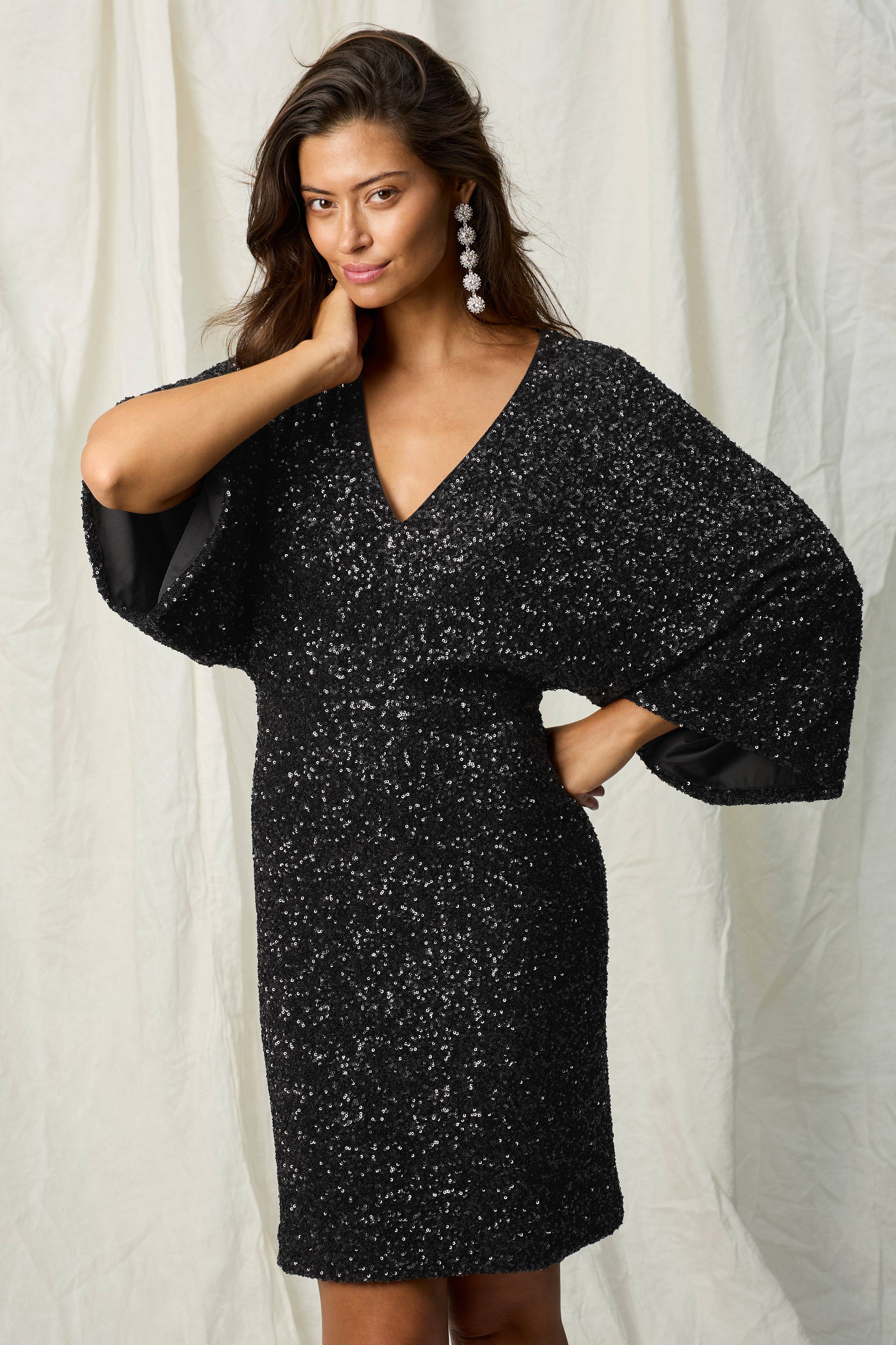 • Figurformede model med broderede pailletter overalt• V-formet halsudskæring• Ekstra bredt, lige kimonoærme• Defineret talje• Foret• Længde: 97 cm i størrelse 36