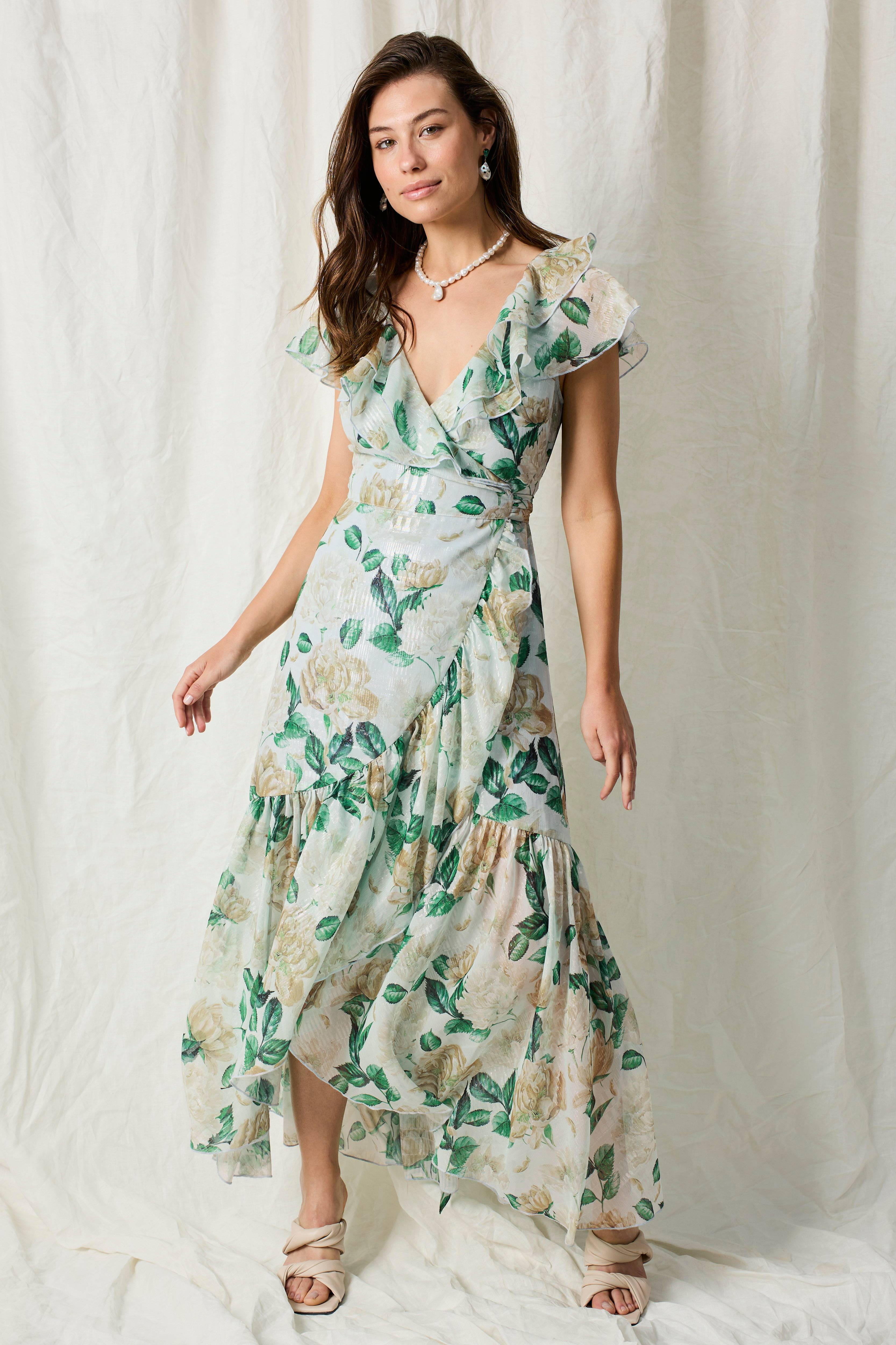 • Slå-om design med snøring i siden• V-udskæring med volant• Korte flagrende ærmer• Volant på skørtet• Åbning i ryggen• Skinnende materiale• Foret• Længde: 131 cm i størrelse 34/36