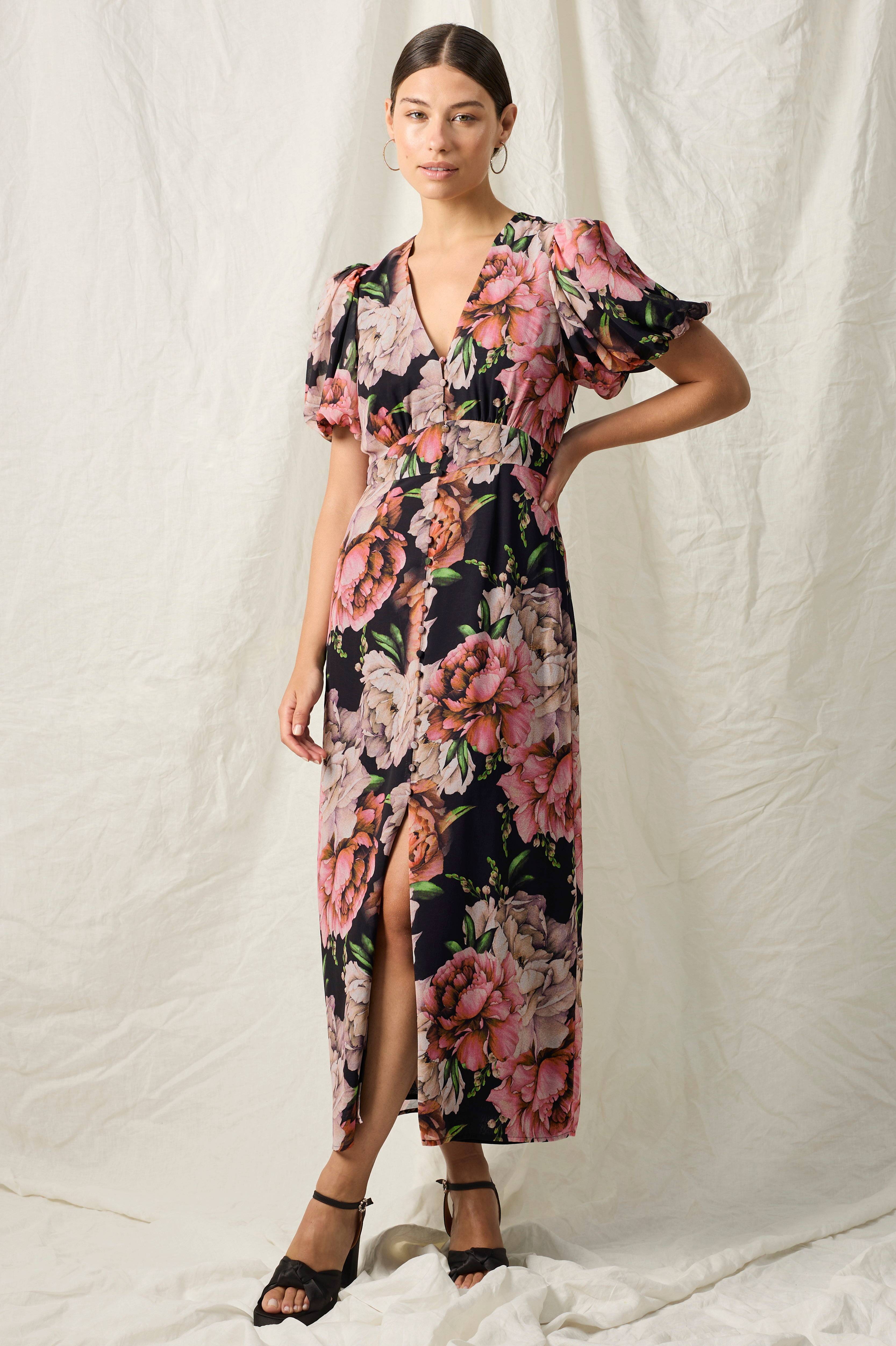 • V-udskæring• Knapper foran• Korte ballonærmer• Tyndt for• Længde: 133 cm i størrelse 36