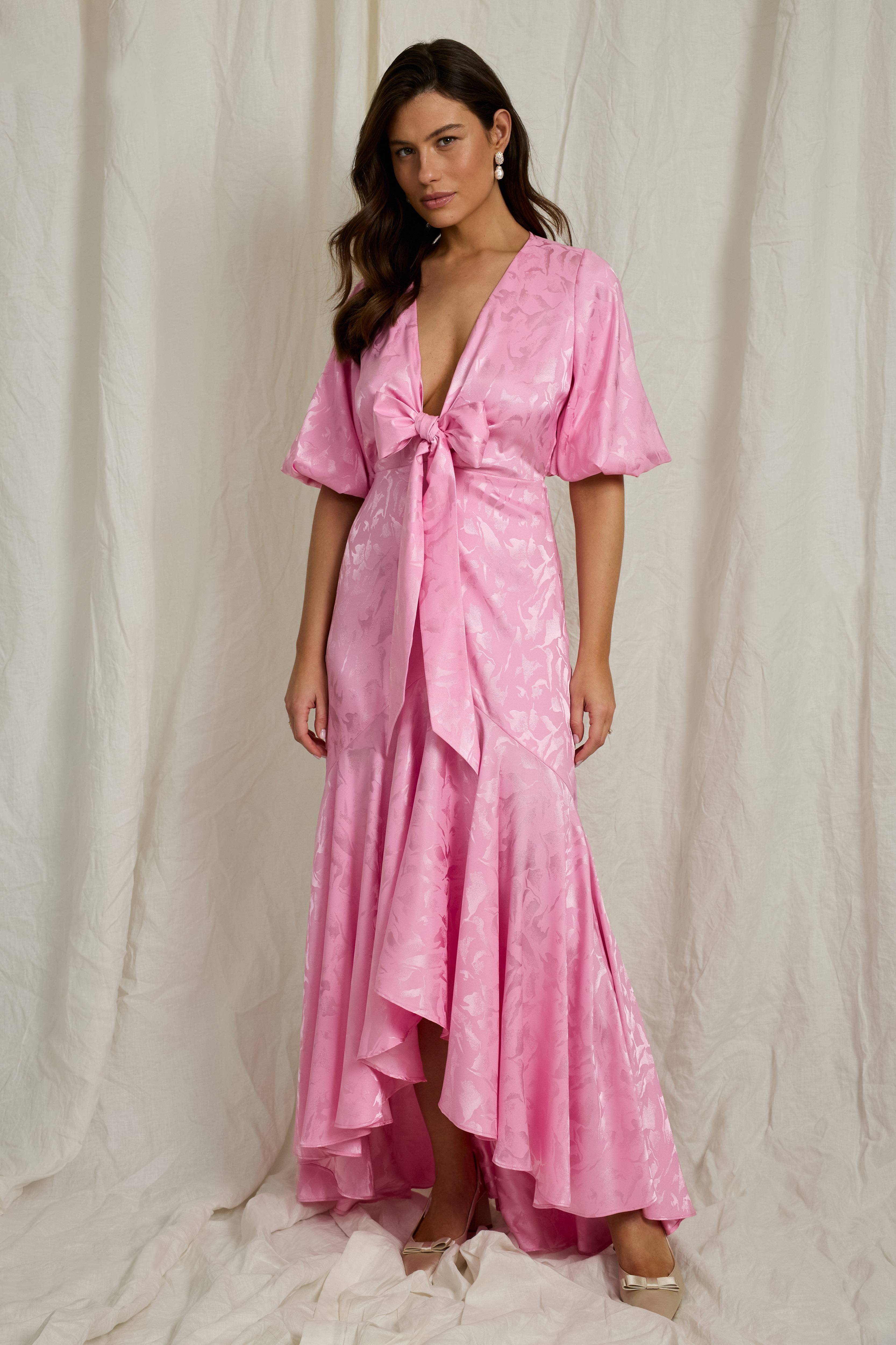 • Lang, elegant kjole i satin med skinnende mønster • V-udskæring med drapering og snøringer • Halvlange ballonærmer • Skjult lynlås i siden • Asymmetrisk søm • Længde: 150 cm i størrelse 36
