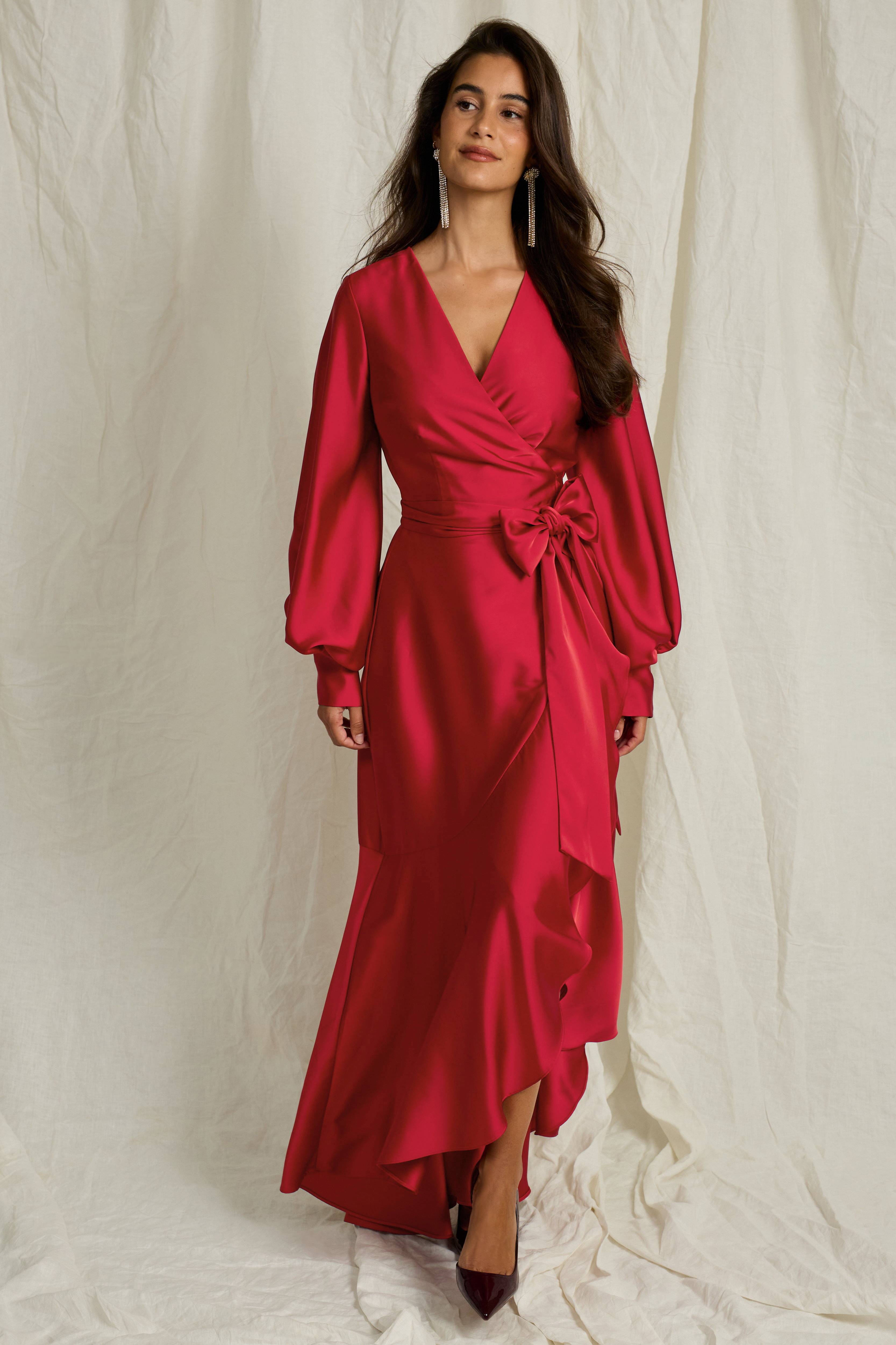 • Lang slå-om kjole i satin • Bred snøring i siden • Voluminøse ballonærmer med manchet • Asymmetrisk nedre del med svaj • Længde: 148 cm i størrelse 36