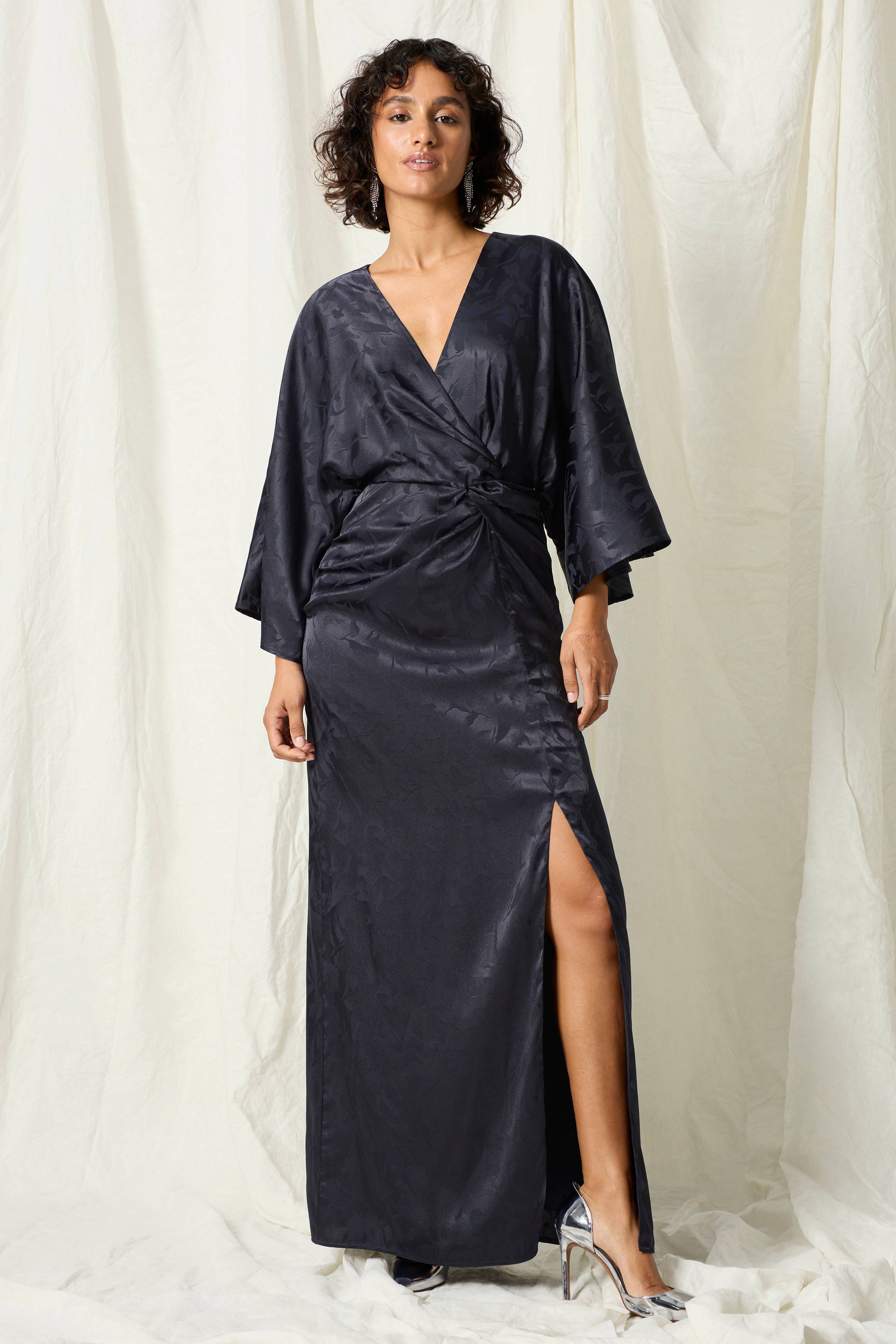 • Lang, figurformede model med drapering foran• Elastisk talje bagpå• Ekstra bredt, kimonoskåret ærme• Lynlås i ryggen• Foret• Længde: 150 cm i størrelse 34/36
