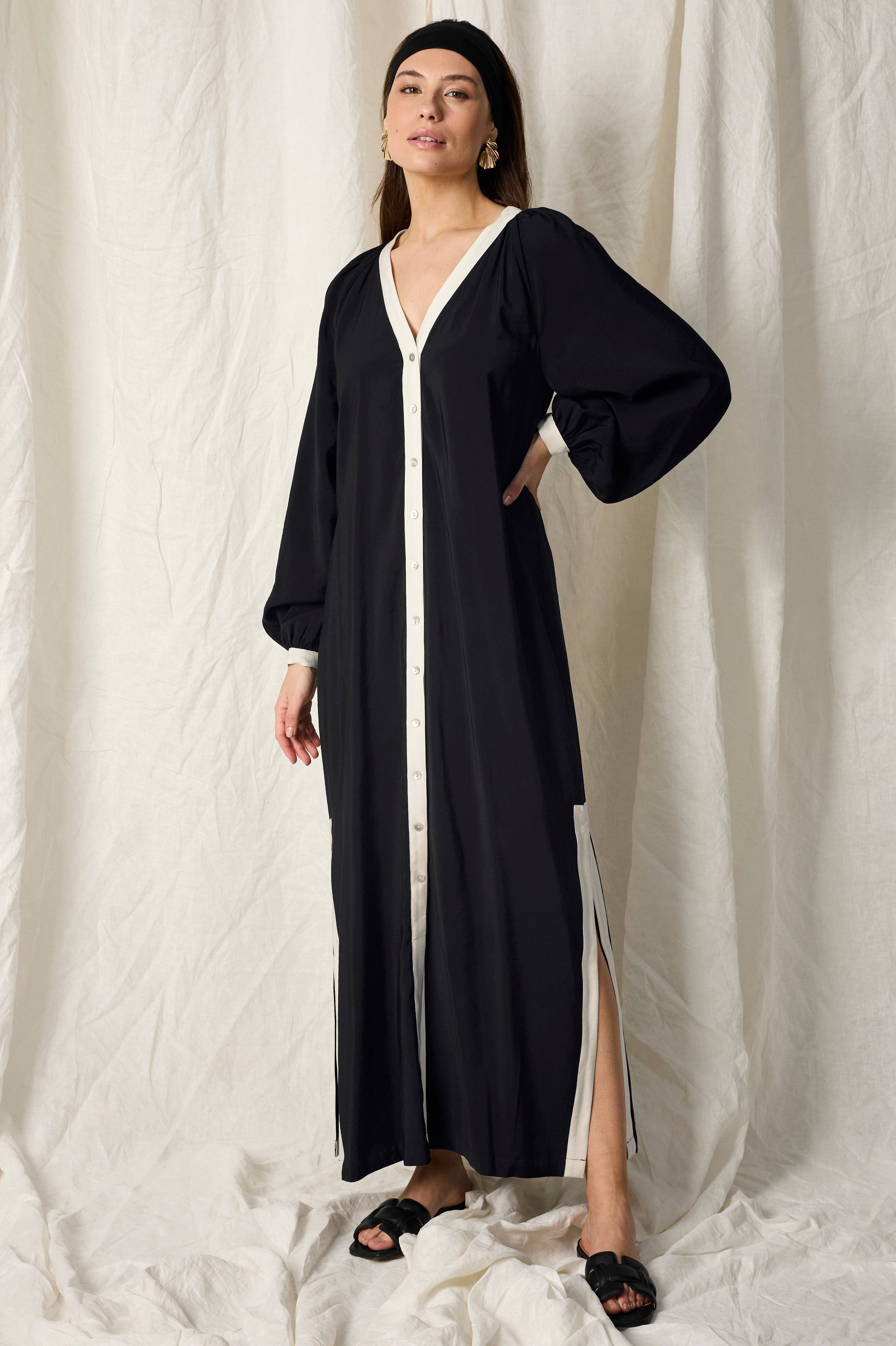 Lang, i princippet fodsid til mine 182 cm. Lidt tungere materiale. Falder virkelig flot. Let at stryge. Størrelse (46/48) helt rigtig med tanke på, at det er en kaftan…