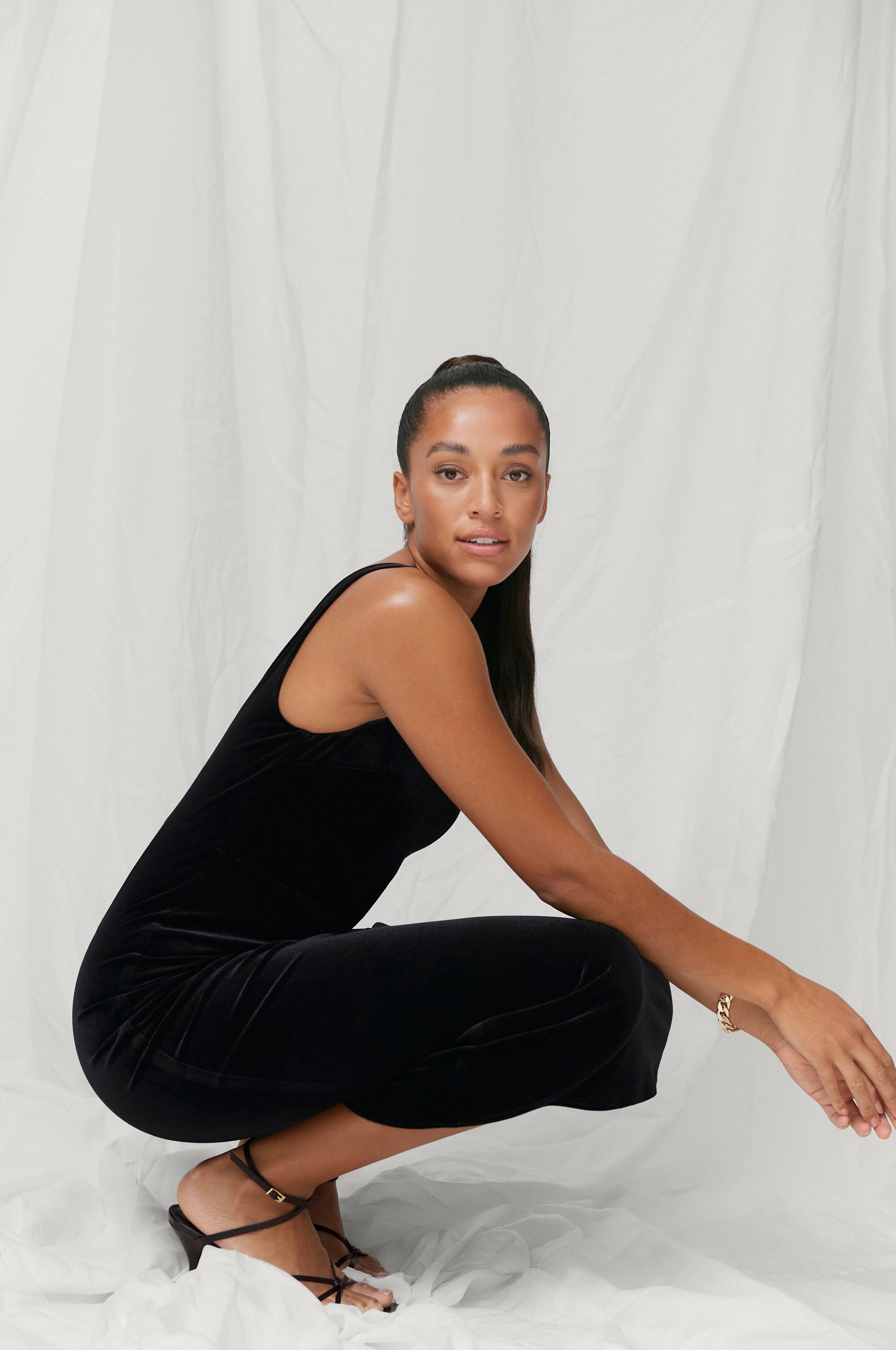 Maxikjole Brandy fra Joelle. Ærmeløs, figursyet i velour med afskæring i taljen. Kantskåret udskæring foroven både foran og bagpå samt brede skulderstropper og skjult lynlås i ryggen. Længde ca. 133 cm i str. 34/36.