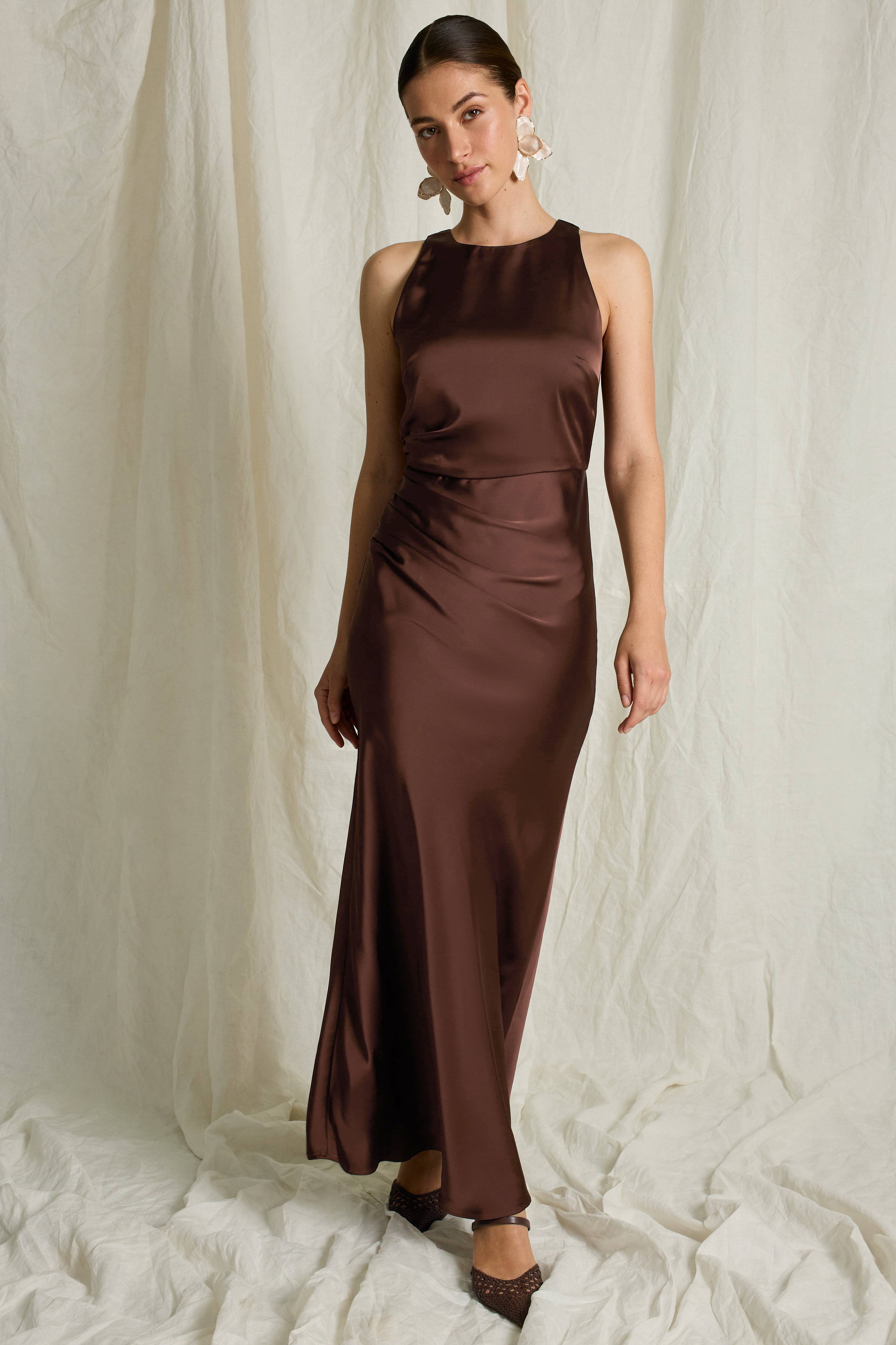 • Ærmeløs, foret maxi kjole i satin • Rund halsudskæring • Drapering ved taljen • Indvendig elastik bagpå ved taljen • Skjult lynlås i ryggen • Længde: 150 cm i størrelse 36