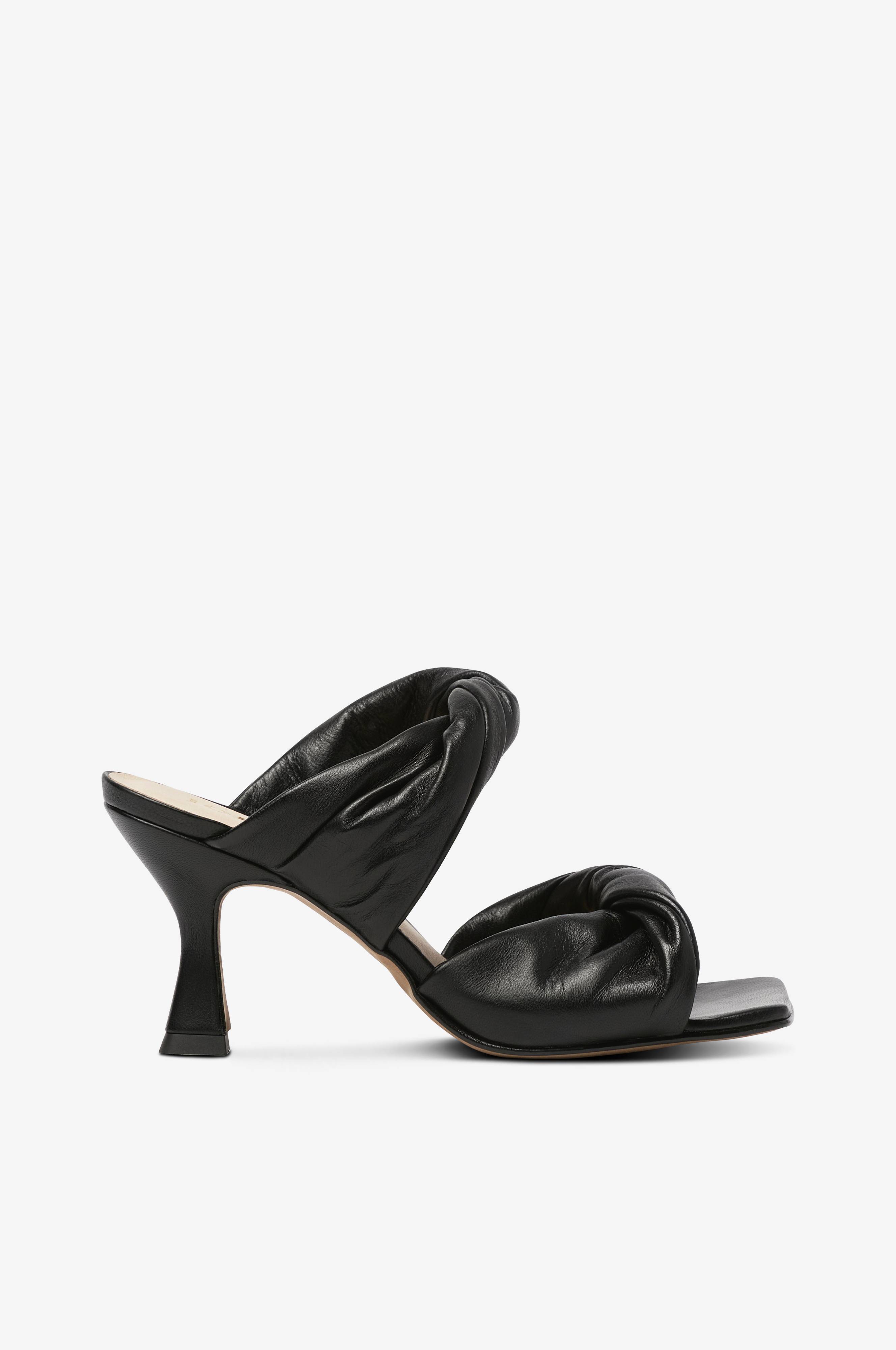 Høj sandal med firkantet tå og snoede remme i skind. Høj, formet hæl. Hælhøjde ca. 8 cm.