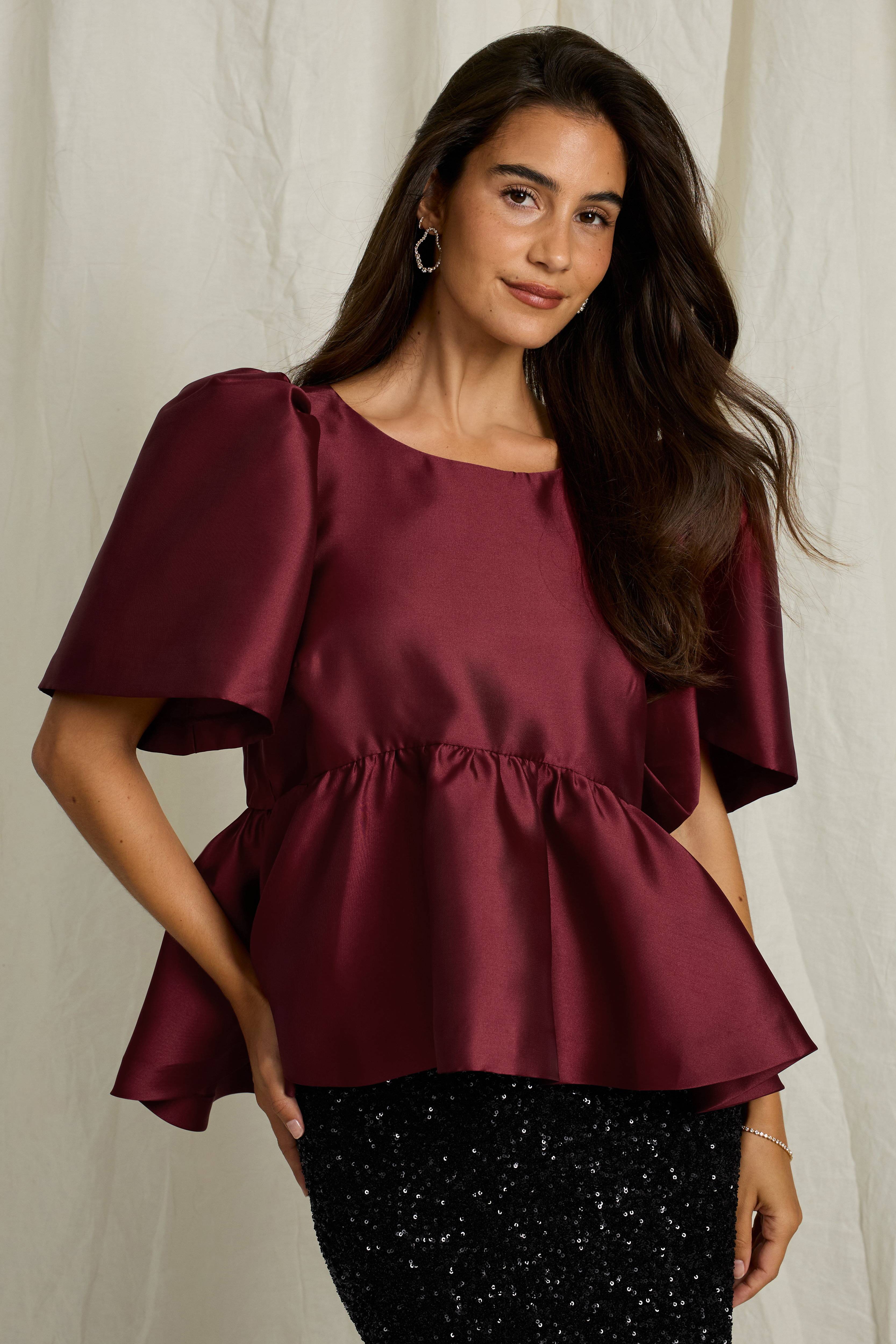 • Satinbluse med brede, korte pufærmer • Peplumdesign • Rund halsudskæring • Nøglehulsåbning med knap bagpå • Rynket talje med indvendig elastik bagpå • Længde: 66 cm i størrelse 36