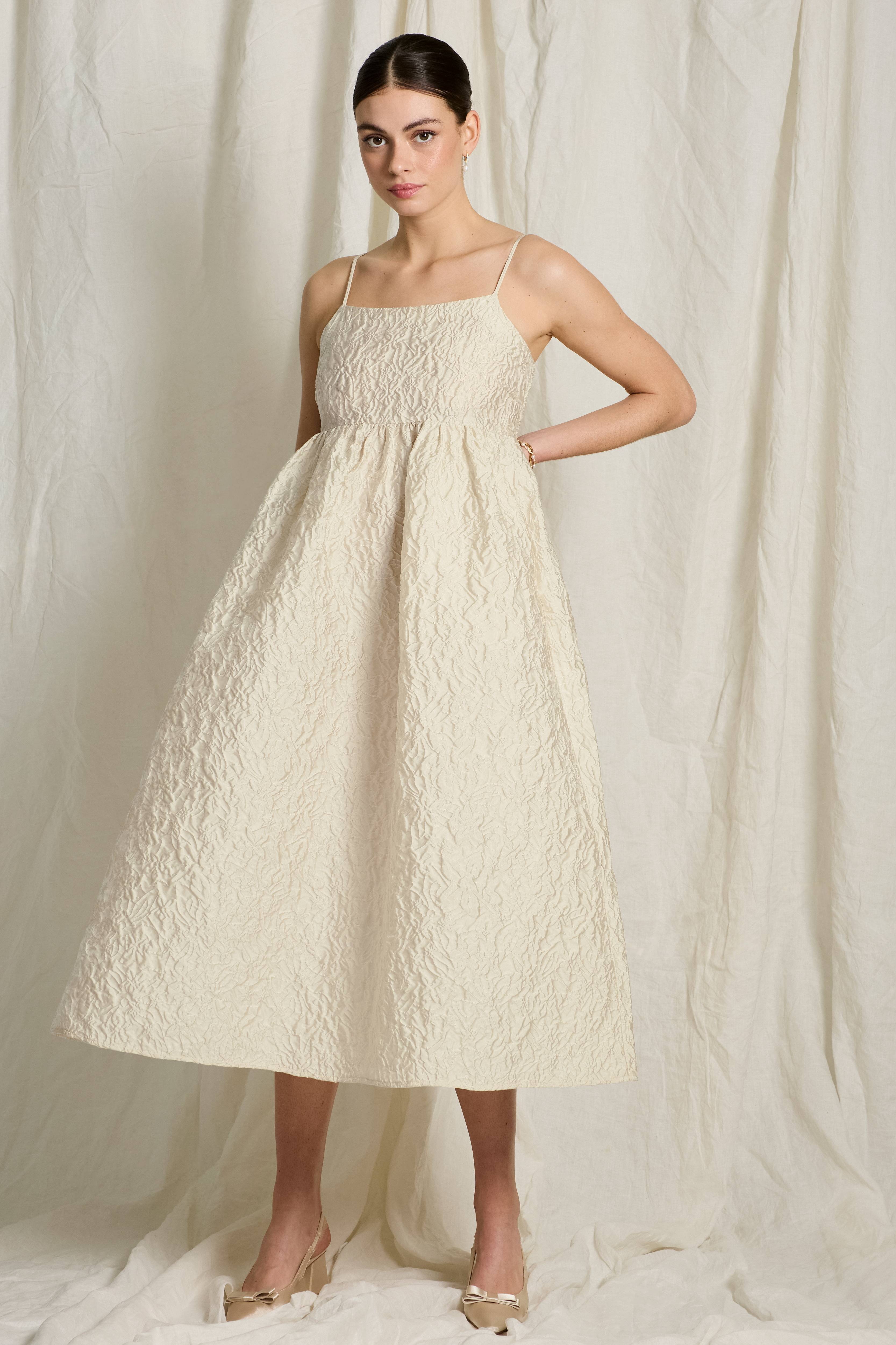 • Ærmeløs model• Tynde, justérbare skulderstropper• Bred, elastisk smock oppe bagved• Rynket talje• Længde: 123 cm i størrelse S