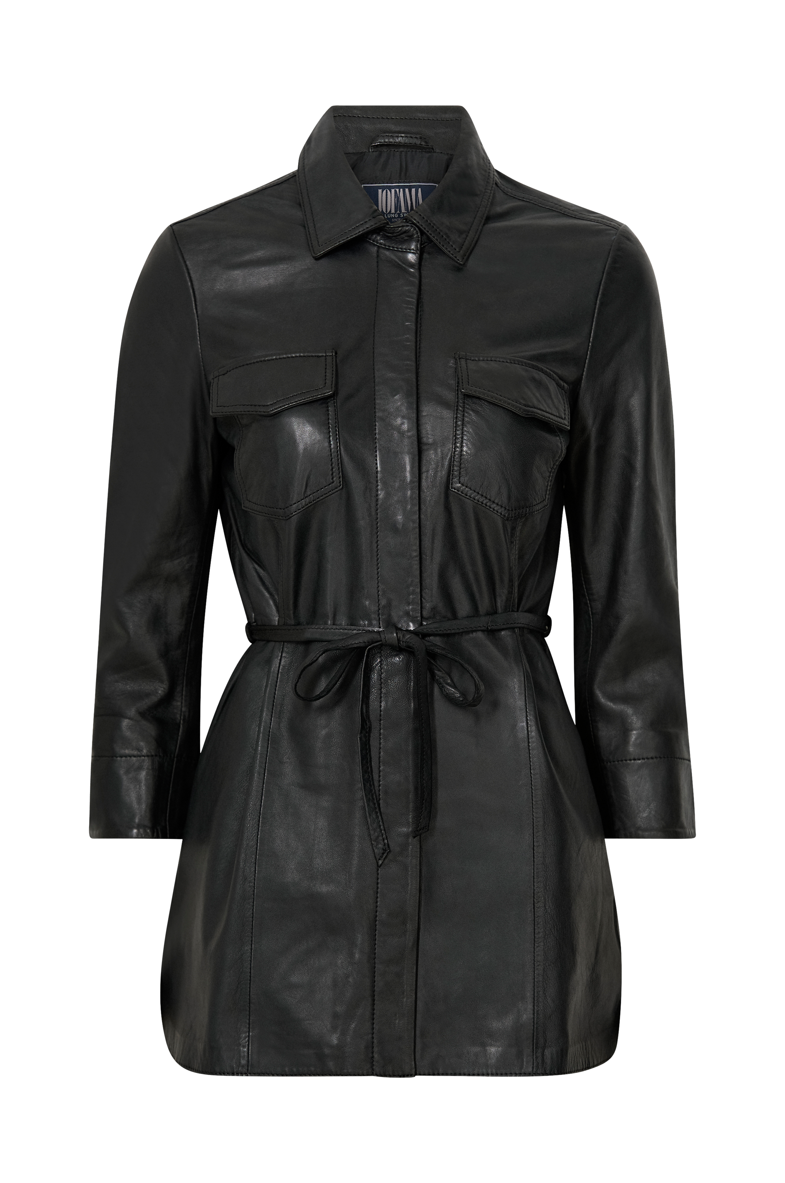 • Model i læder med tyndt bæltespænde ved taljen• Knapstolpe med skjulte trykknapper• Brystlommer• Langt ærme med slids ved manchetterne• Afrundede slidser nede i siderne• Længde: 78 cm i størrelse 36