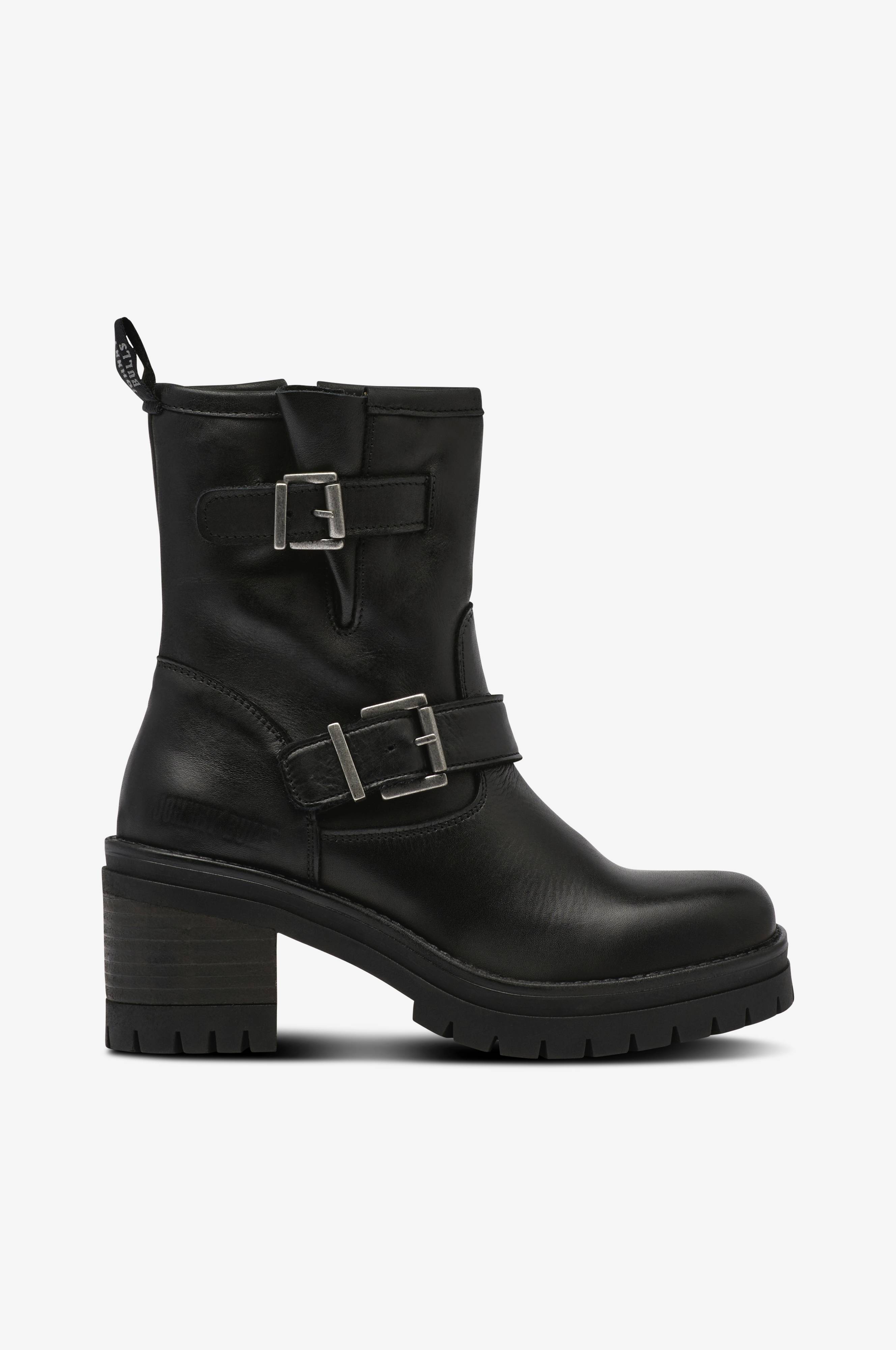 • Boots i læder med blokhæl• To dekorative metallukninger på ydersiden af skaftet• Lynlås på indersiden af skaftet• Vævet trækstrop bag på skaftet• For i læder• Ydersål i gummi• Hælhøjde: 6 cm• Skafthøjde: 16 cm i str. 37