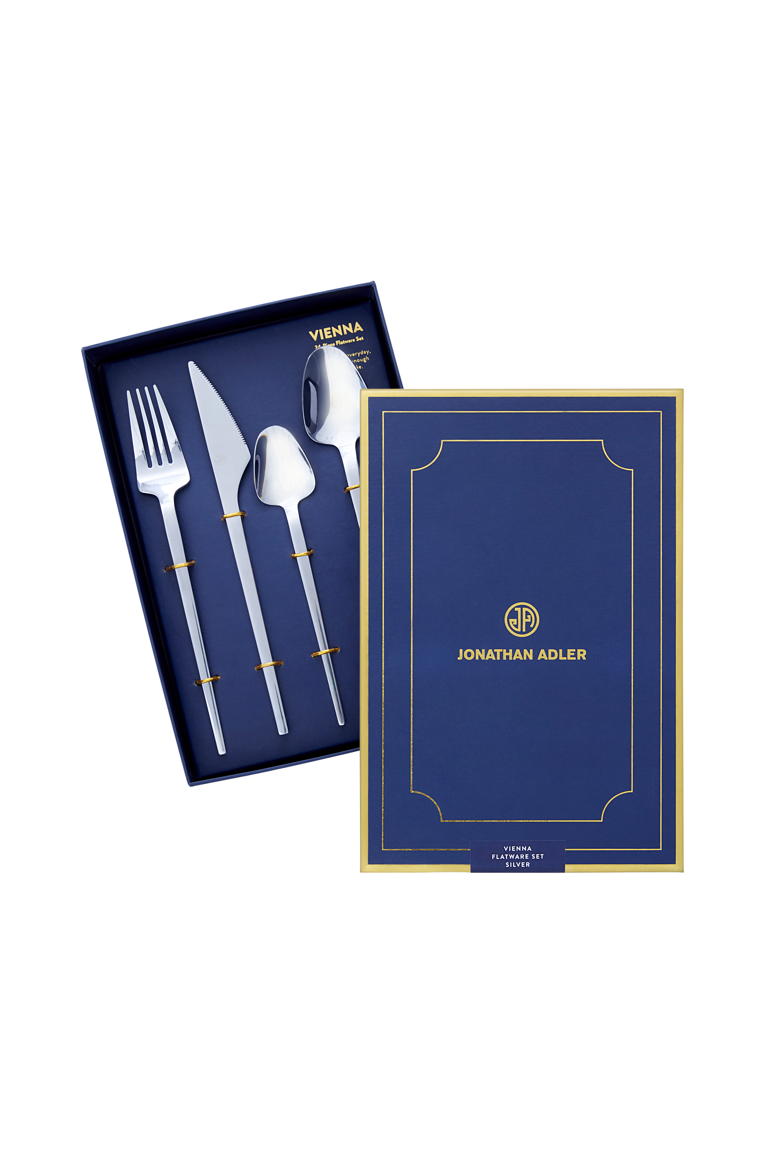 Vienna bestik løfter middagsbordet til nye højder. Elegant bestik, som leveres i en chic indpakning. Sættet består af 24 dele - 6 gafler (21 cm), knive (22 cm), spiseskeer (20 cm) og teskeer (17 cm). Materialet er stål og serien findes i pudset sølv eller børstet guld. Kan vaskes i opvaskemaskine.