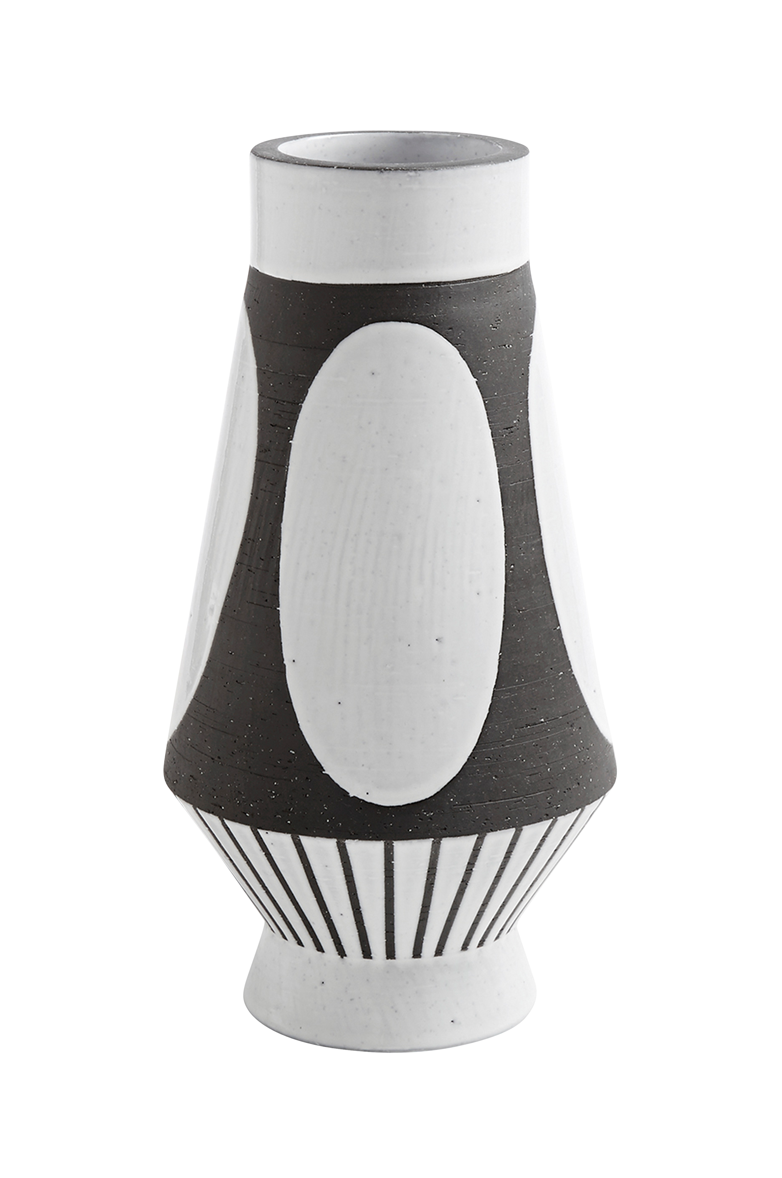 Vasen Dots fra serien Palm Springs er et sandt mesterstykke i keramik fra dygtige håndværkere i Jonathan Adlers workshop i Peru. Vasen signalerer couture med sin grafik. Diameter 17 cm, højde 32 cm.