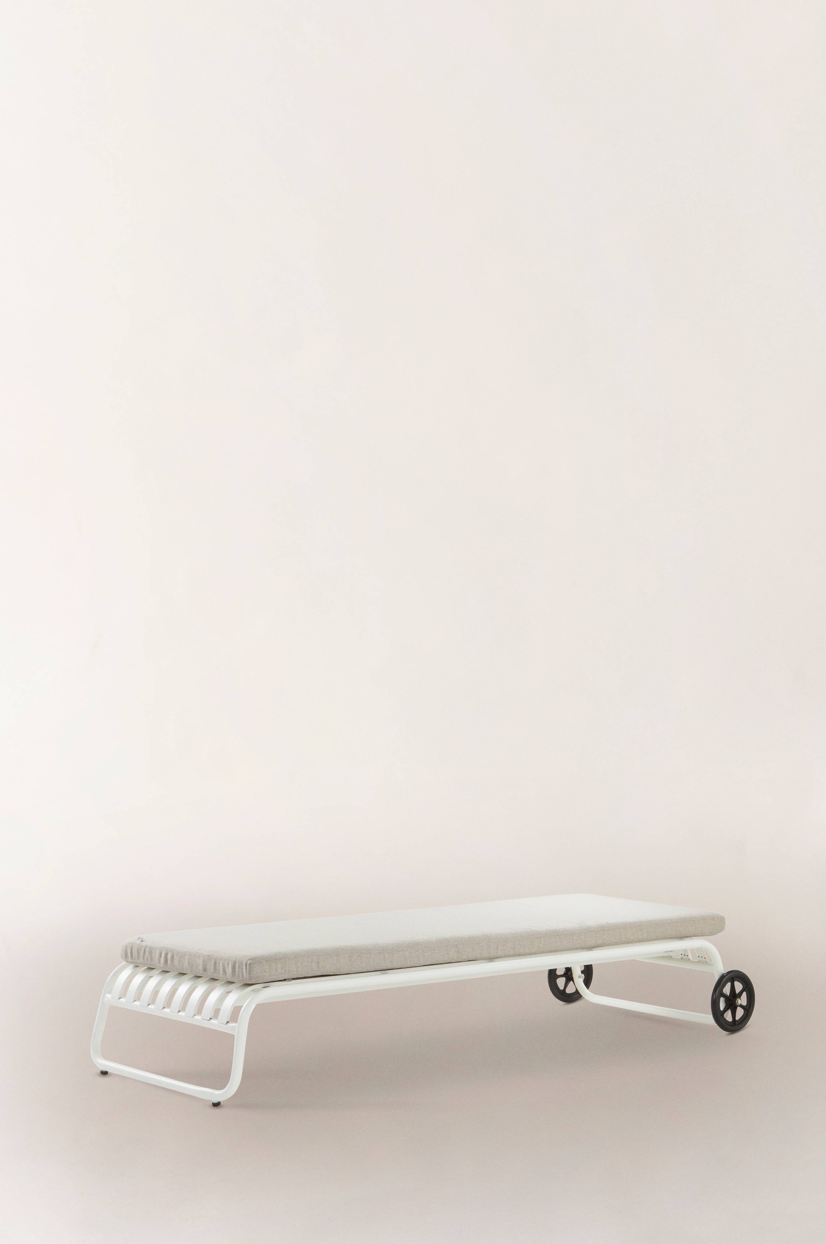 Solseng af aluminium med mat overflade og tilhørende madras med betræk af polyester og fyld af skumplastgummi. Serien NERJA har bløde linjer men er også cool i sit udtryk. Aluminiumsprofilen er lidt kraftigere, men aluminium er et let materiale, så NERJA har en lav vægt. Solsengen har et stilrent design med metalhjul i hovedenden som gør det nemt at flytte den. Madrassen er fastgjort med velcrobånd der sættes rundt om metalstellet. Betrækket er aftageligt, lynlås langs den ene kant. NERJA tåler at stå udendørs, aluminium ruster ikke og er nemt at tørre af.