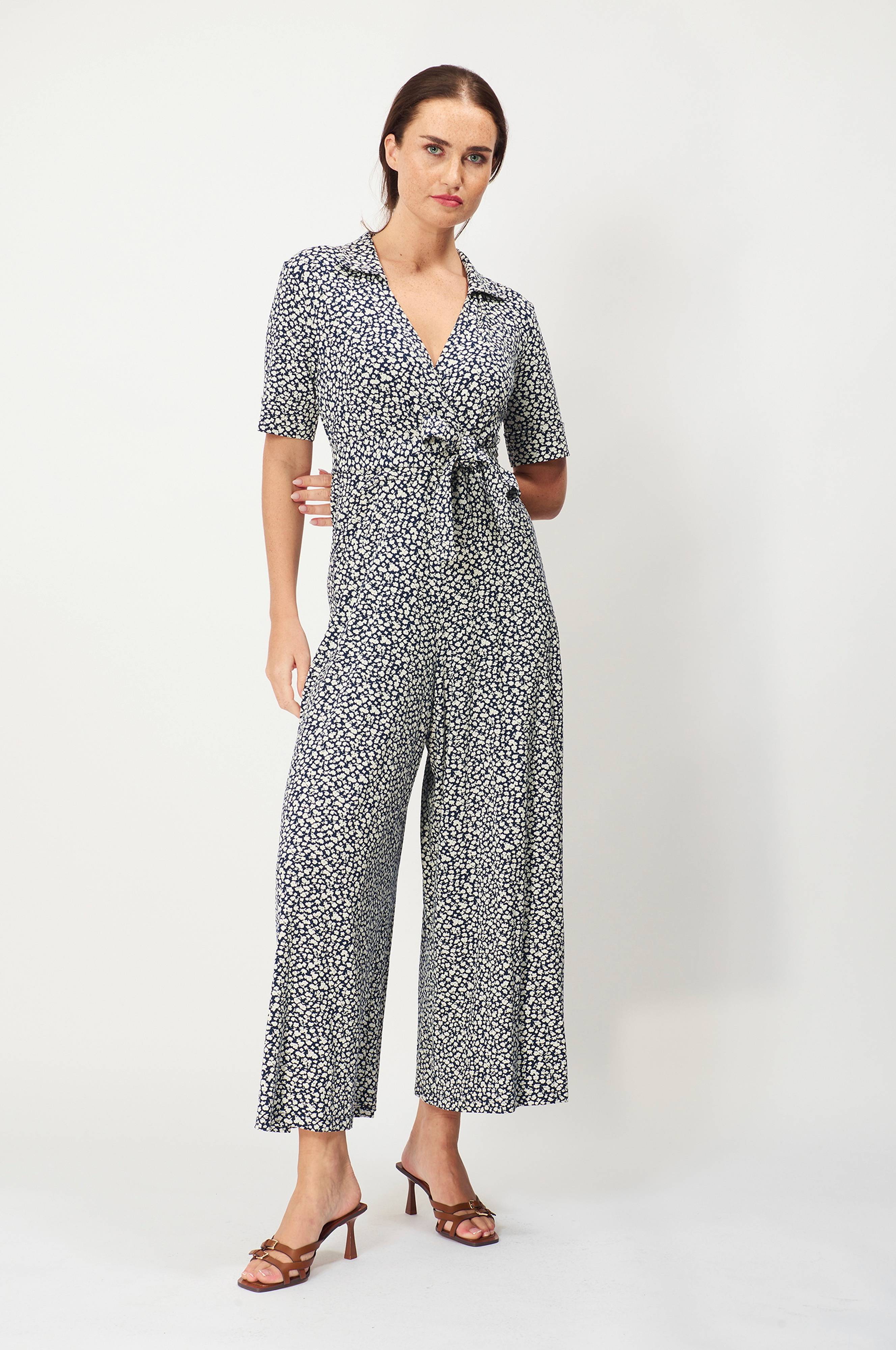 En meget flatterende jumpsuit i en viskoseblanding. Designet har en tætsiddende top med korte ærmer og en overdel i slå-om-stil. De trekvartlange ben er brede forneden. Inkluderer et aftageligt bælte. Det perfekte jumpsuit til både afslappede og formelle lejligheder!