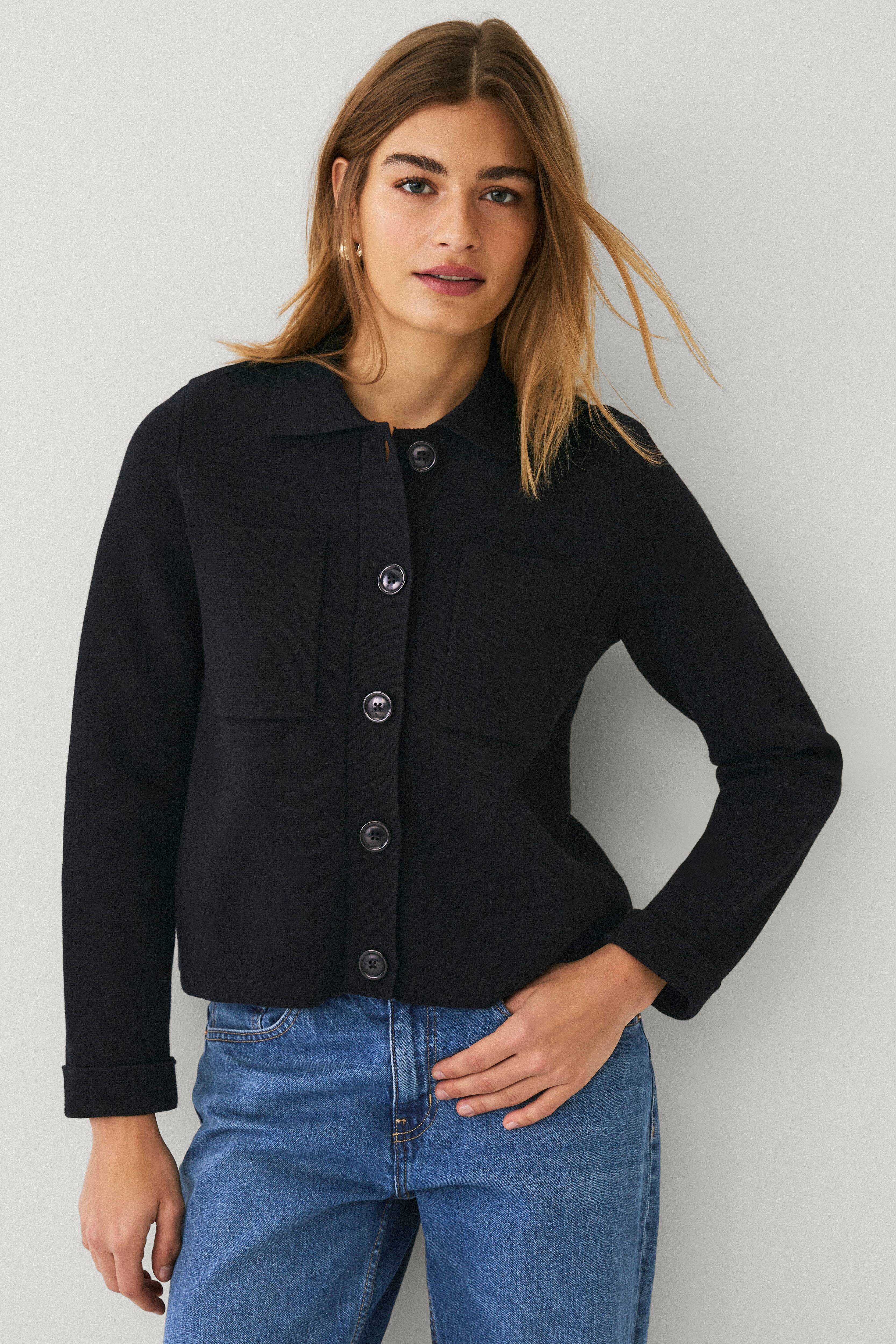 • Strikket cardigan i blød bomuld• Lige, lidt kort model• Lommer foran• Krave• Knaplukning• Lille oprullet ved manchetterne